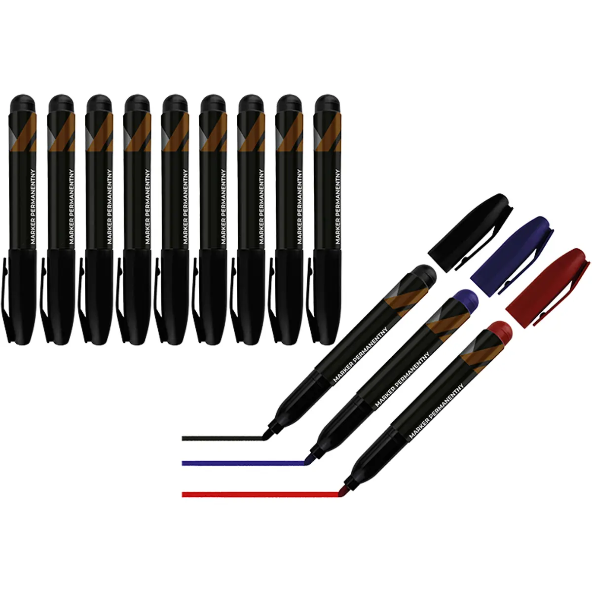 Este pacote inclui 12 marcadores - 10 pretos, 1 azul e 1 vermelho. Eles possuem uma ponta redonda com 5 mm de espessura e produzem uma linha de escrita com cerca de 2 mm de espessura. A ponta é protegida por um invólucro de plástico, garantindo a sua durabilidade e impedindo o ressecamento. Além disso, esses marcadores são resistentes e secam rapidamente, tornando-os adequados para uso em condições climáticas diversas.