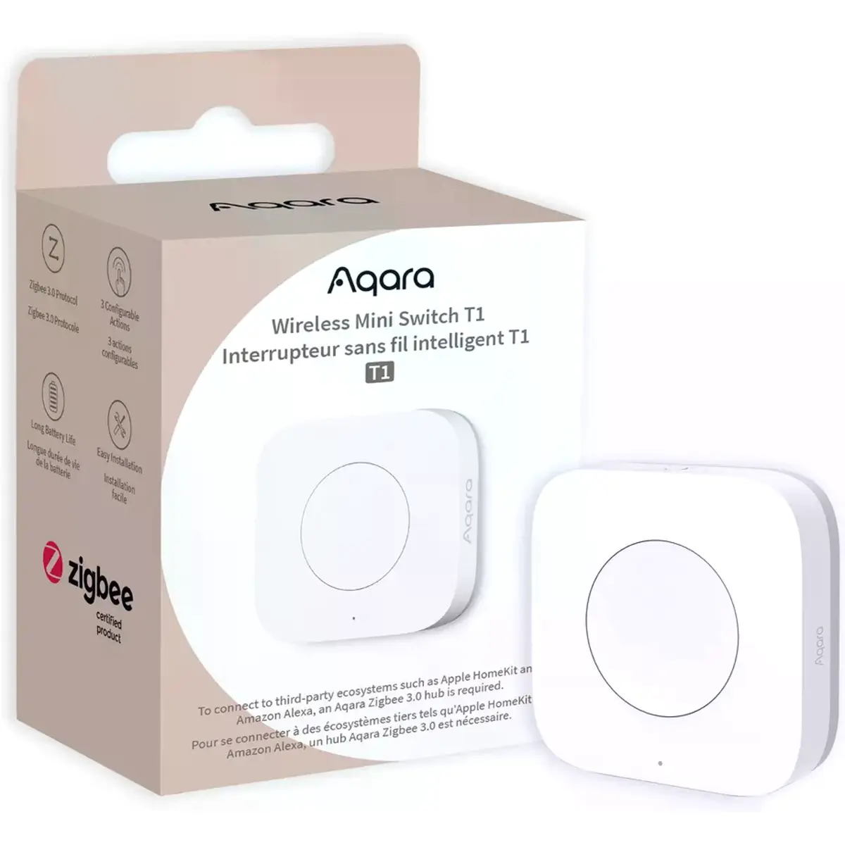 O Aqara Wireless Mini Switch T1 pode ser pressionado mais de 50000 vezes e é feito de um material resistente ao fogo. Em comparação com o Mini Switch original, o modelo T1 já tem suporte para atualizações OTA, o que permite melhorias na estabilidade e funcionalidade.