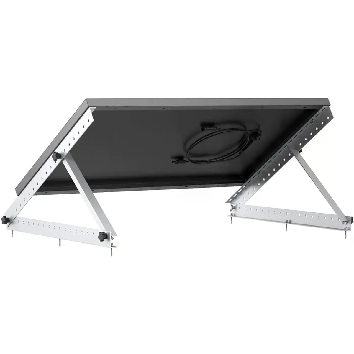 Suporte de painel solar com inclinação ajustável de 0 a 90°, permitindo captar melhor a energia solar. A instalação é simples graças aos furos pré-perfurados e pode ser montado em superfícies planas, incluindo telhados de autocaravanas. Com 710mm de comprimento, é compatível com painéis solares rígidos de 100W, oferecendo estabilidade para soluções móveis ou fixas.
