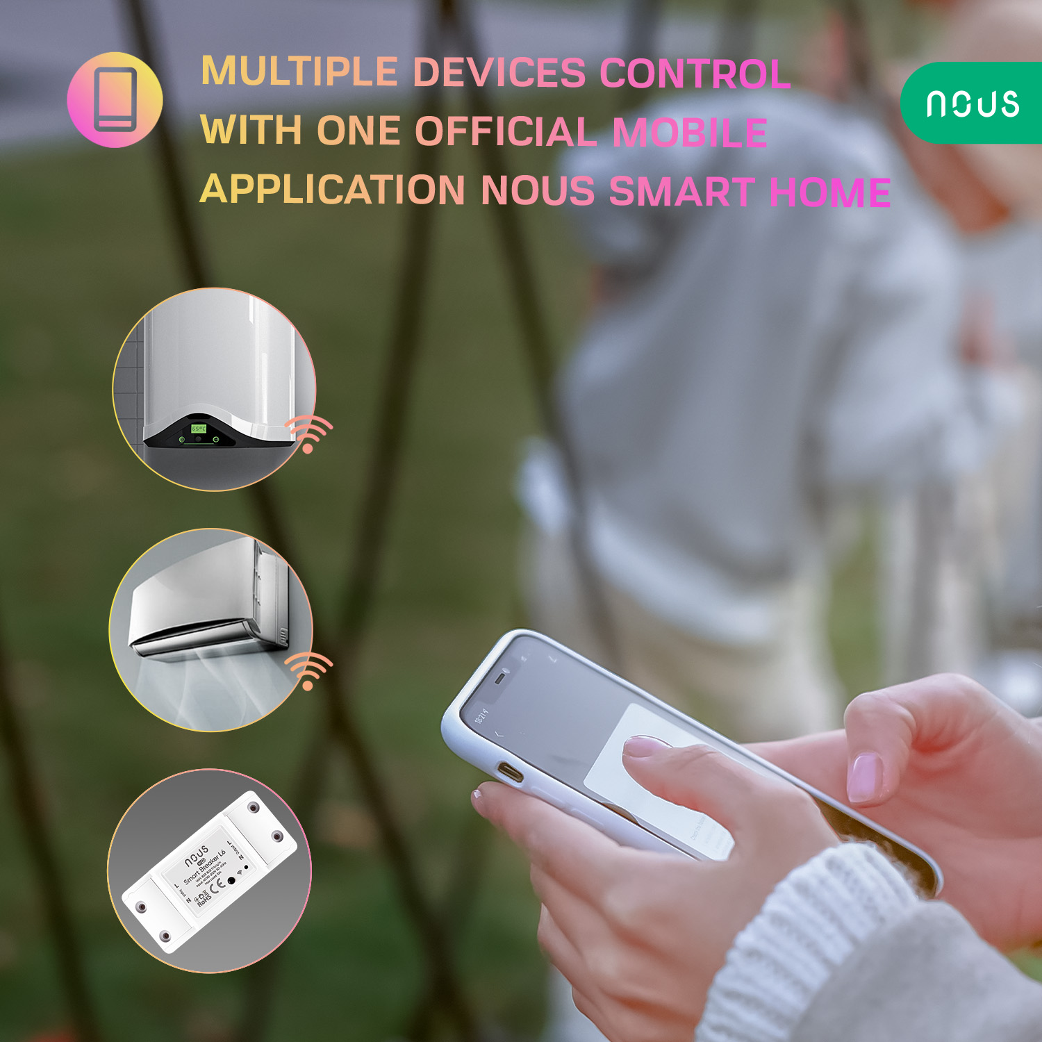 O NOUS L6 (WiFi Smart Switch Breaker) é um relé inteligente que permite controlar qualquer dispositivo que consuma não mais do que 10A de corrente, com um simples toque na App do Smartphone ou através de comandos de voz. Com ele, poderá transformar os seus candeeiros, ventiladores, aquecedores e outros aparelhos em dispositivos inteligentes, que poderão funcionar com Alexa, Google Home, Tuya Smart Life e Nous Smart. Poderá definir horários, temporizadores, cenas e rotinas para automatizar sua casa inteligente.