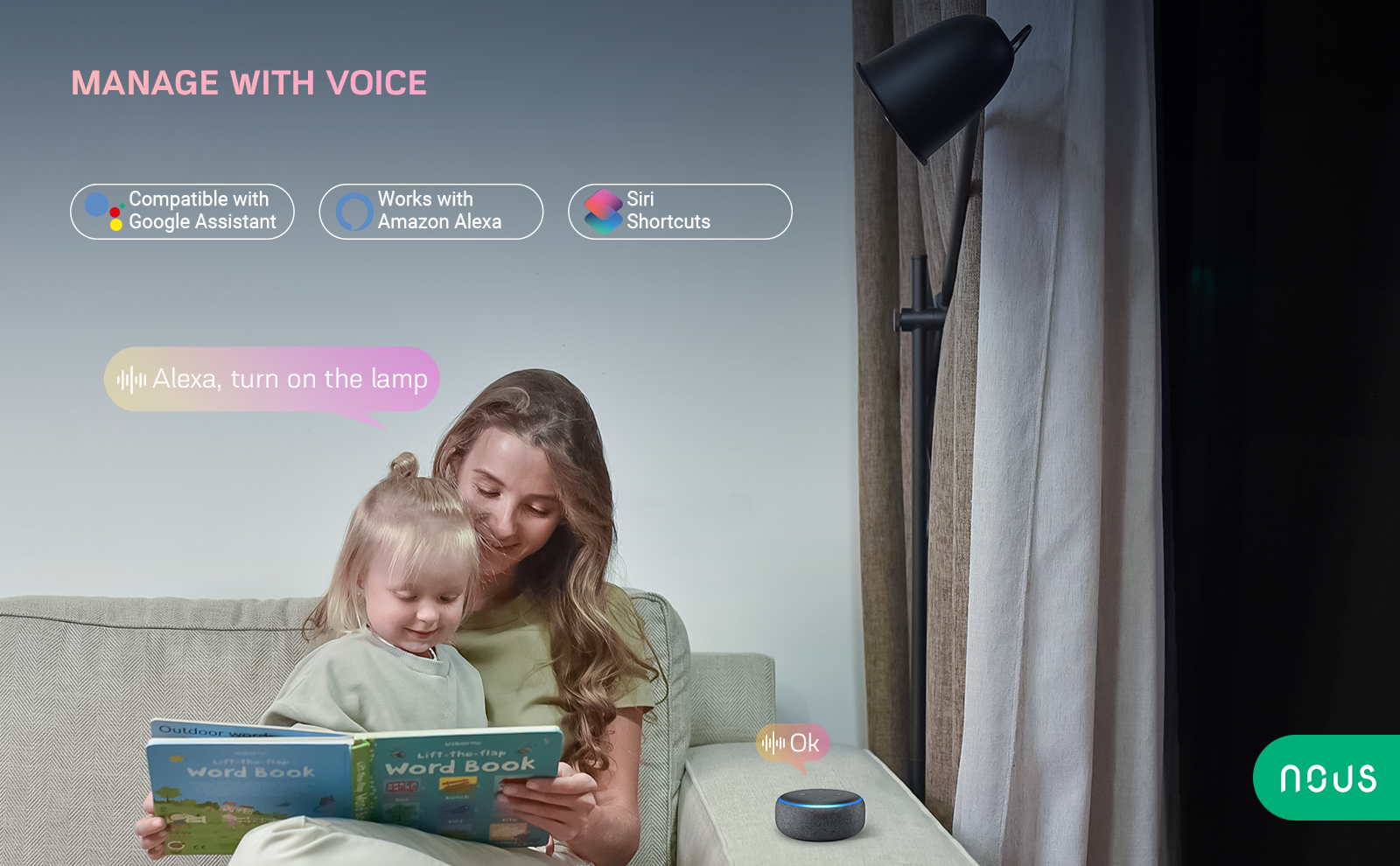 ● Controle as suas luzes e aparelhos de qualquer lugar com seu telefone ou voz.