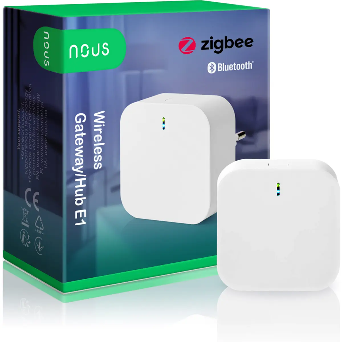 O NOUS E1 (Smart ZigBee Gateway) é um Hub inteligente que permite controlar até 128 dispositivos inteligentes que possuam conectividade Zigbee e/ou Bluetooth, como sensores, luzes, interruptores e fichas inteligentes.