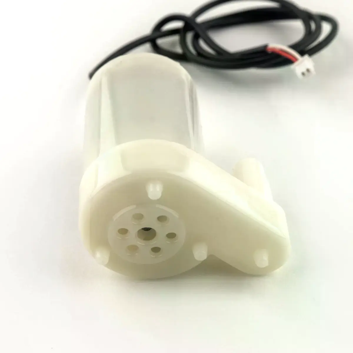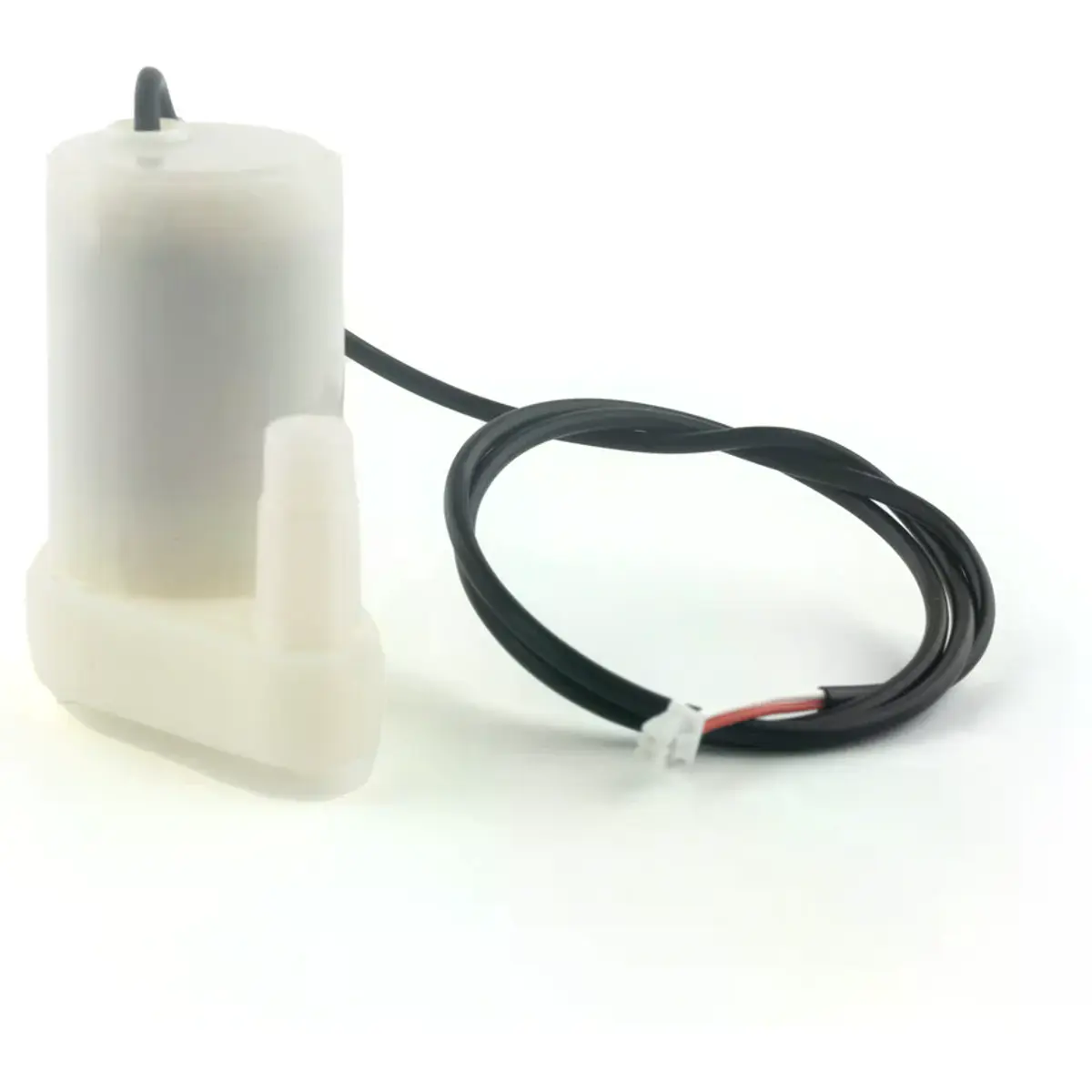 Bomba submersível centrífuga de 4,5 VDC para rega automática de plantas e fontes de água pequenas. Oferece impermeabilização IP68, conector Molex Picoblade de 2 pinos com passo de 1,25 mm, cabo de aproximadamente 40 cm e dimensões de 43 x 38,5 x 25,5 mm. A saída tem 7,8 mm de diâmetro na parte mais larga, diminuindo para 6,5 mm, com altura máxima de água de 0,55 m. Funciona com baixo consumo (0,18 A, 0,91 W). Recomendada evitar funcionamento a seco para prolongar a vida do motor. Adequada para experiências científicas, pequenas fontes de água e aplicações automáticas de irrigação.