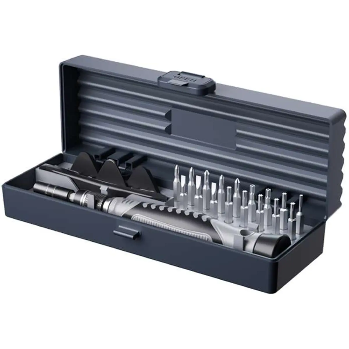 Conjunto de ferramentas de precisão para reparação eletrónica e abertura de telemóveis, com 25 peças, incluindo 17 pontas cromadas, extensão para parafusos de difícil acesso, suporte manual magnetizado, tampa rotativa de 360°, caixa de transporte e acessórios como pinças, ventosa e triângulos. Ideal para iniciantes e entusiastas de bricolage, este conjunto oferece qualidade de fabrico e utilidade para projetos variados de electrónica.
