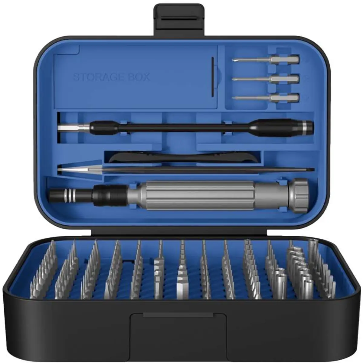 Conjunto de chaves de precisão para reparação de smartphones e computadores, com 117 pontas em aço cromado de vanádio. Possui punho de alumínio magnetizado com haste de extensão e tampa rotativa de 360°, design ergonómico, extensão flexível e caixa de transporte elegante. Ideal para técnicos e entusiastas, oferecendo durabilidade, organização e versatilidade em reparos de dispositivos móveis e computadores.
