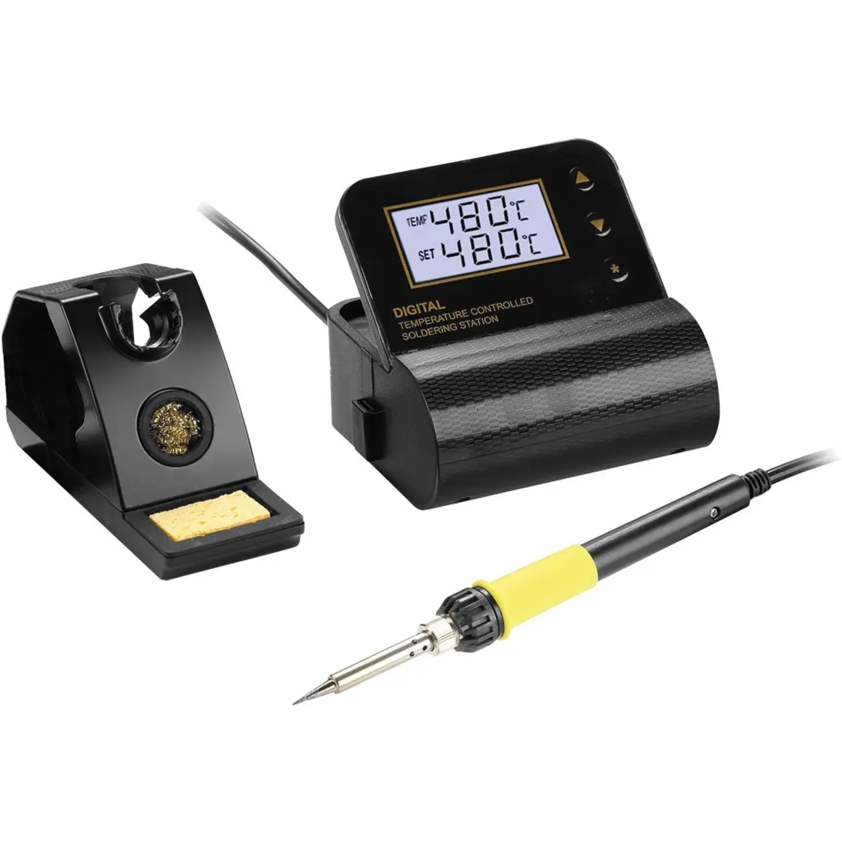 O ferro de soldar com controlo por microprocessador aquece rapidamente, garantindo eficiência e estabilidade durante o trabalho. O suporte integrado inclui uma esponja vegetal e uma esponja abrasiva, permitindo manter a ponta sempre limpa e assegurar resultados consistentes.