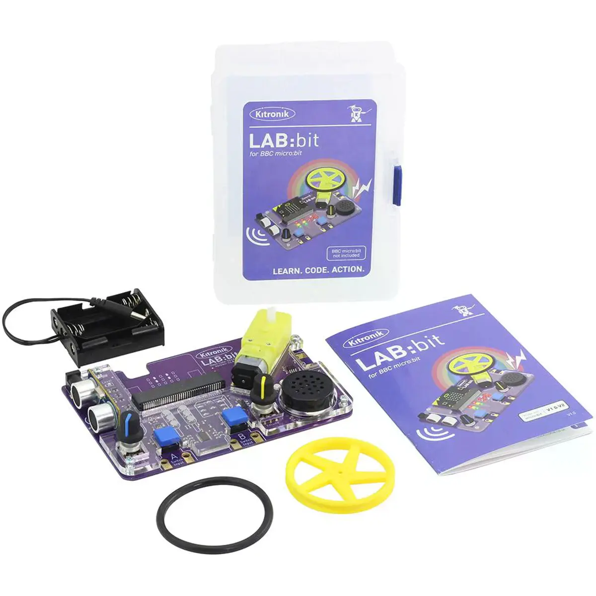 O Kitronik LAB:bit para o BBC microbit oferece uma forma super divertida para as crianças aprenderem acerca da programação, de uma forma envolvente e prática. Foi especialmente concebido para a sala de aula, para o 2.º ciclo da informática, e é apoiado por tutoriais online do MakeCode, blocos personalizados simplificados e um guia detalhado de início rápido. Na caixa, são fornecidos um suporte de bateria (3 x AA), uma roda e pneu para o motor, e um guia detalhado, fácil de seguir.