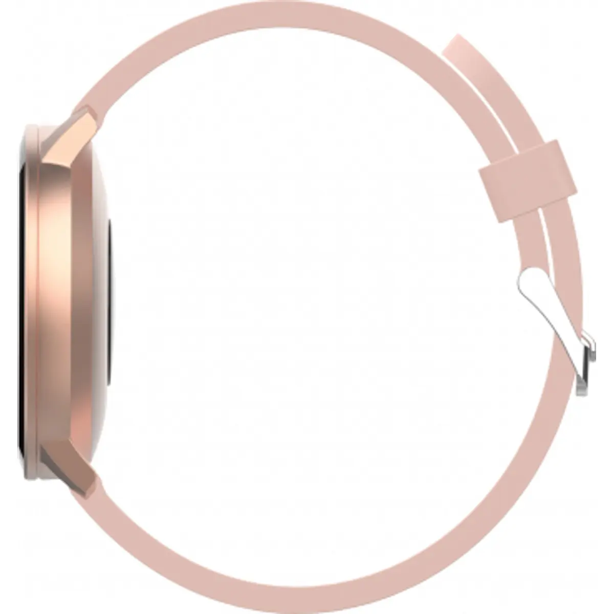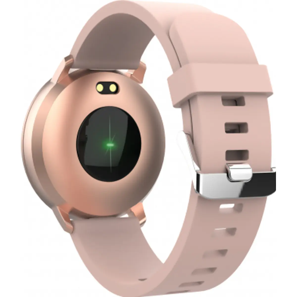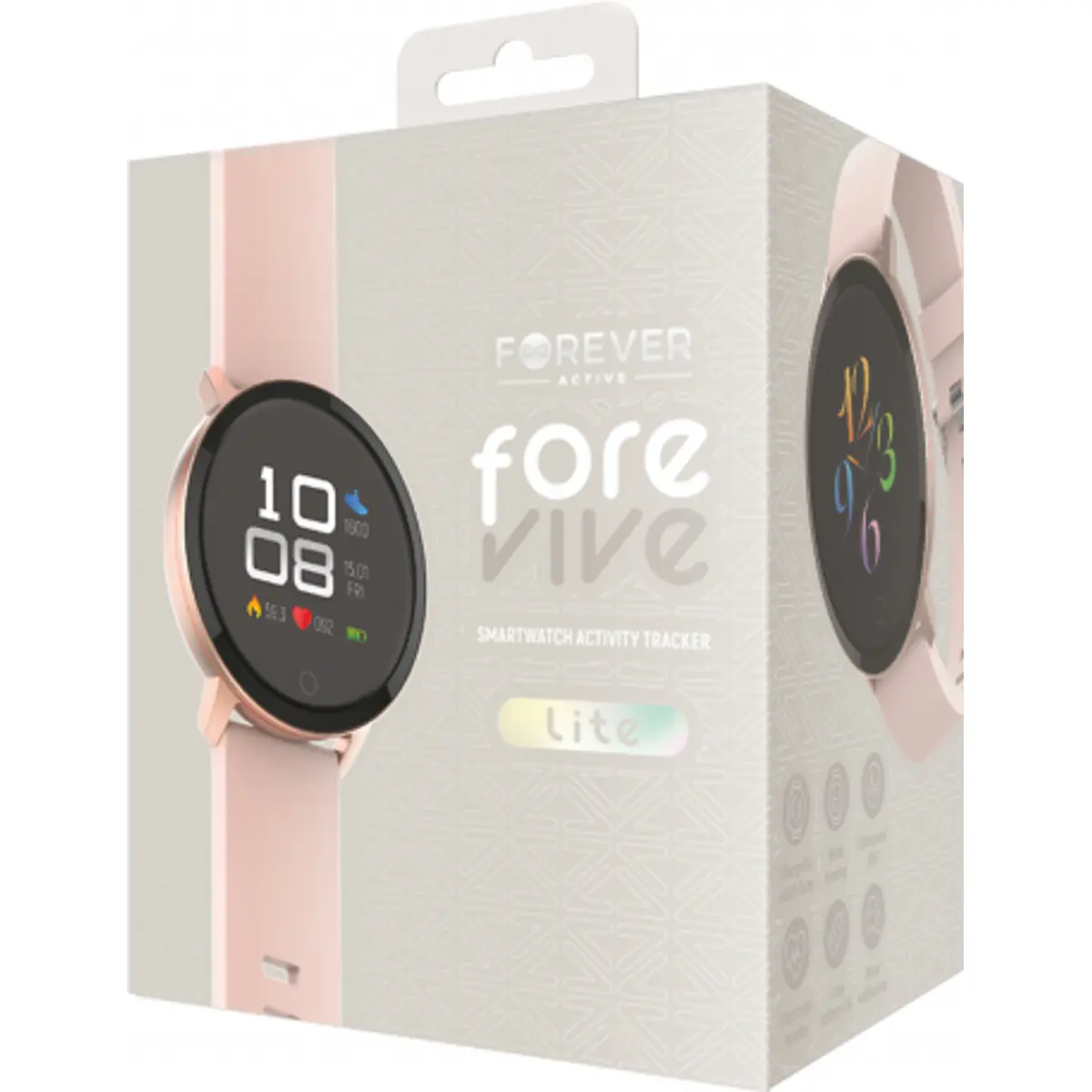Relógio inteligente com Bluetooth 5.0 e IP67, ecrã tátil de 1.3 polegadas com vidro temperado. Monitoriza frequência cardíaca, pressão arterial, oxigénio no sangue, calorias, passos e qualidade do sono, e mostra notificações de chamadas, mensagens e redes sociais através do aplicativo Forever Smart. Compatível com iOS e Android via Forever Smart. Possui modo desportivo para caminhada, corrida, ciclismo e natação, sincronizando dados com o smartphone. Bateria de 155mAh, com autonomia até 10 dias em uso normal (30 dias em standby). Carregamento magnético. Cor ouro rosa.