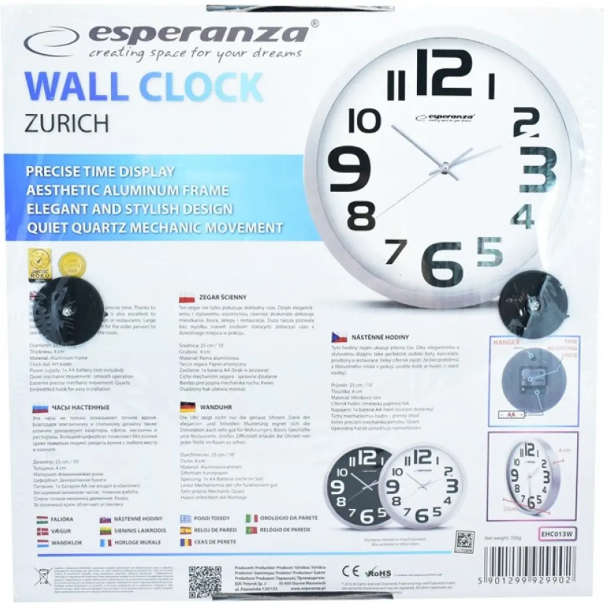 Relógio de parede analógico em alumínio ∅25x4cm - Branco - ESPERANZA Zurique (EHC013W)