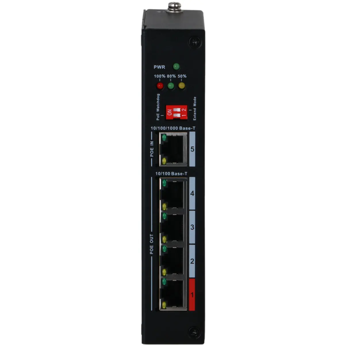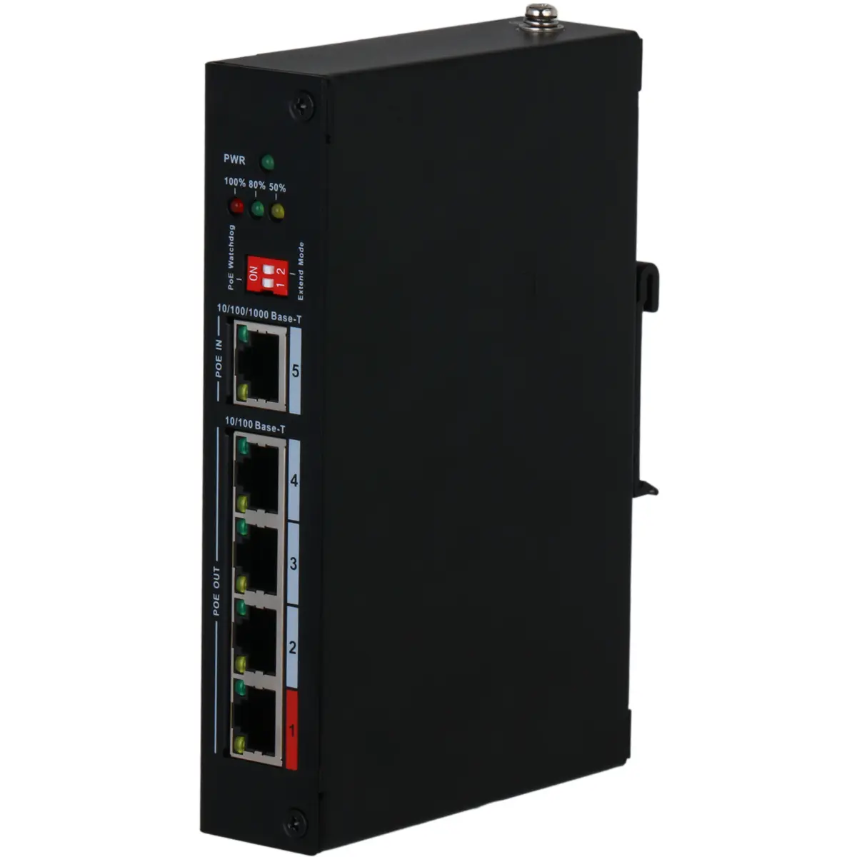 O dispositivo é um extensor PoE robusto, projetado para funcionar em conjunto com dispositivos PoE convencionais, ampliando a distância máxima de transmissão para até 350 metros.