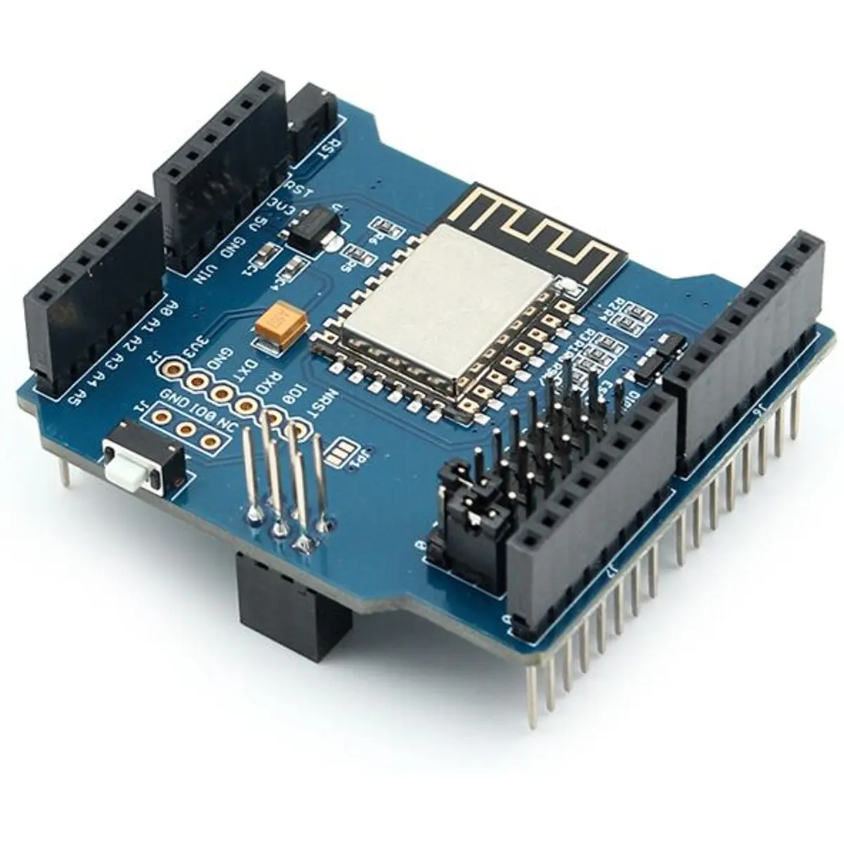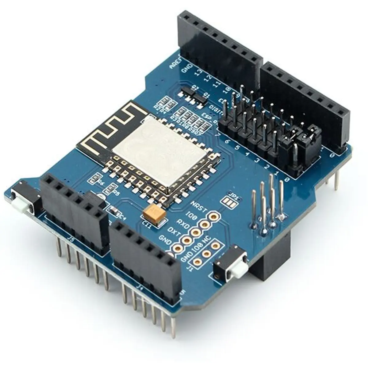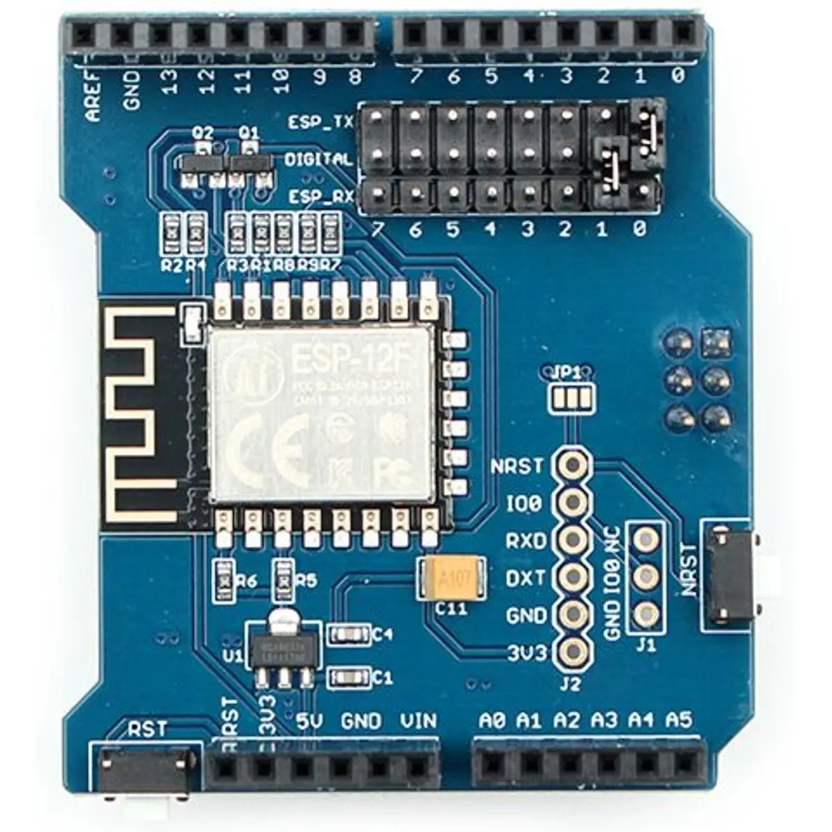 Este shield foi desenhado para eliminar a complexidade das ligações por cabos, integrando o módulo ESP-12F numa plataforma "plug-and-play" compatível com o layout standard do Arduino Uno, Mega e Leonardo. Graças aos conversores de nível lógico integrados, este módulo garante uma comunicação estável entre os 5V do Arduino e os 3.3V do chip WiFi, tornando-o numa ferramenta robusta tanto para prototipagem rápida como para aplicações de Internet das Coisas (IoT) em ambientes académicos ou profissionais.