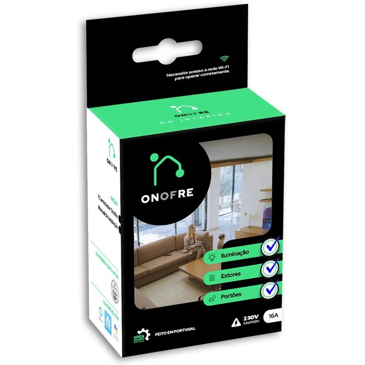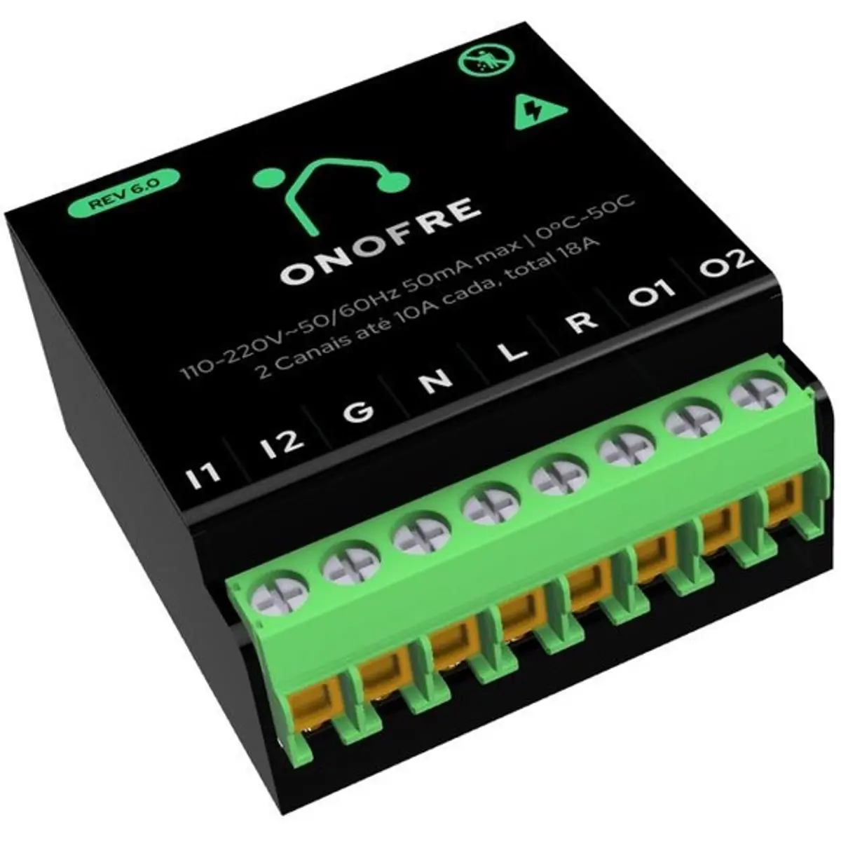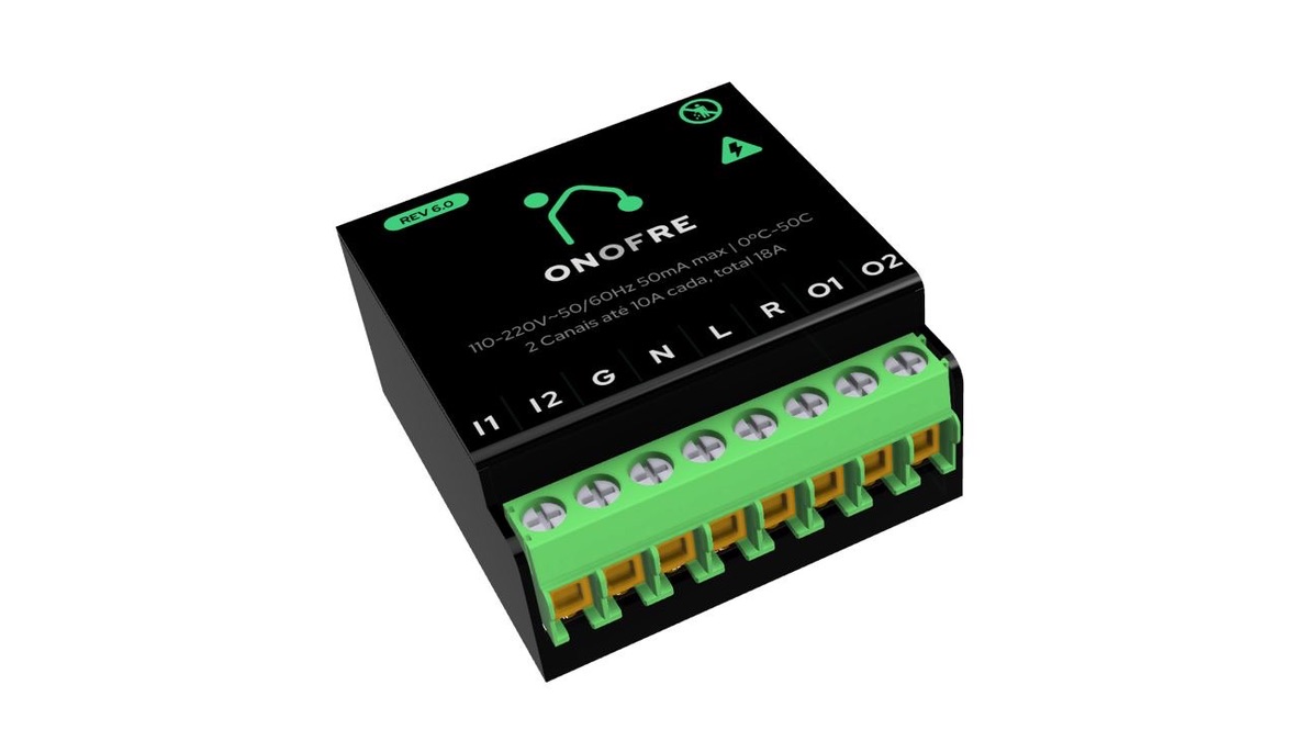 cortinas. O OnoFre V6 é um relé inteligente com conectividade WiFi e Bluetooth. Suporta até 16A por canal e uma corrente total de 20A (tolera picos de 30A).