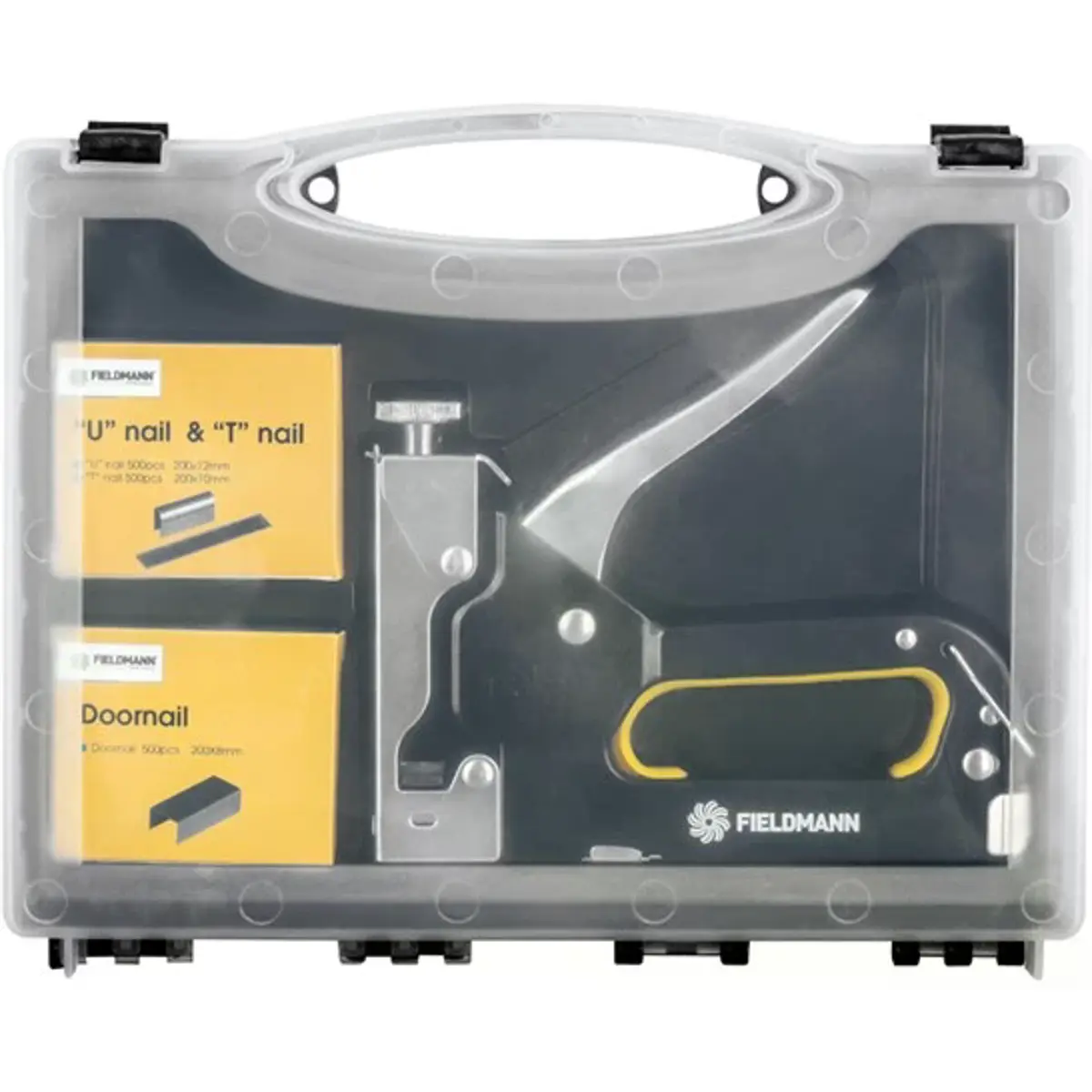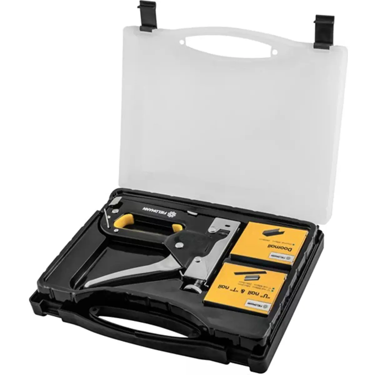 Precisa de fixar uma lona, costurar uma capa de tecido numa estrutura de móveis de madeira ou costurar caixas de cartão? Sem um agrafador, não é possível fazê-lo. Experimente este versátil agrafador FIELDMANN FDN 3001, capaz de lidar com qualquer tipo de agrafos para o seu trabalho na oficina. Além do agrafador, o conjunto inclui uma prática caixa de plástico com três tipos de agrafos sobressalentes em quantidade suficiente (1500 peças). O agrafador foi projetado para agrafos redondos e retangulares, bem como pregos.
