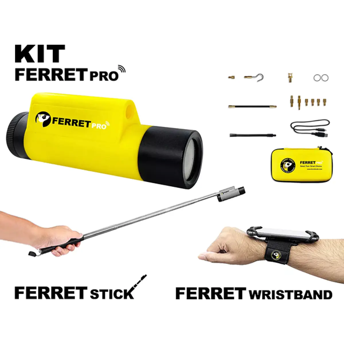 A Ferret Pro é uma câmara de inspeção profissional da Ferret Tools, conhecida por suas inovações em tecnologia de câmeras inteligentes. Este kit inclui não apenas a câmera, mas também a Pulseira FERRET Wristband, com suporte rotativo para smartphones de 3.5" a 6", e a Vara extensível FERRET stick, em aço inox com 140 cm.