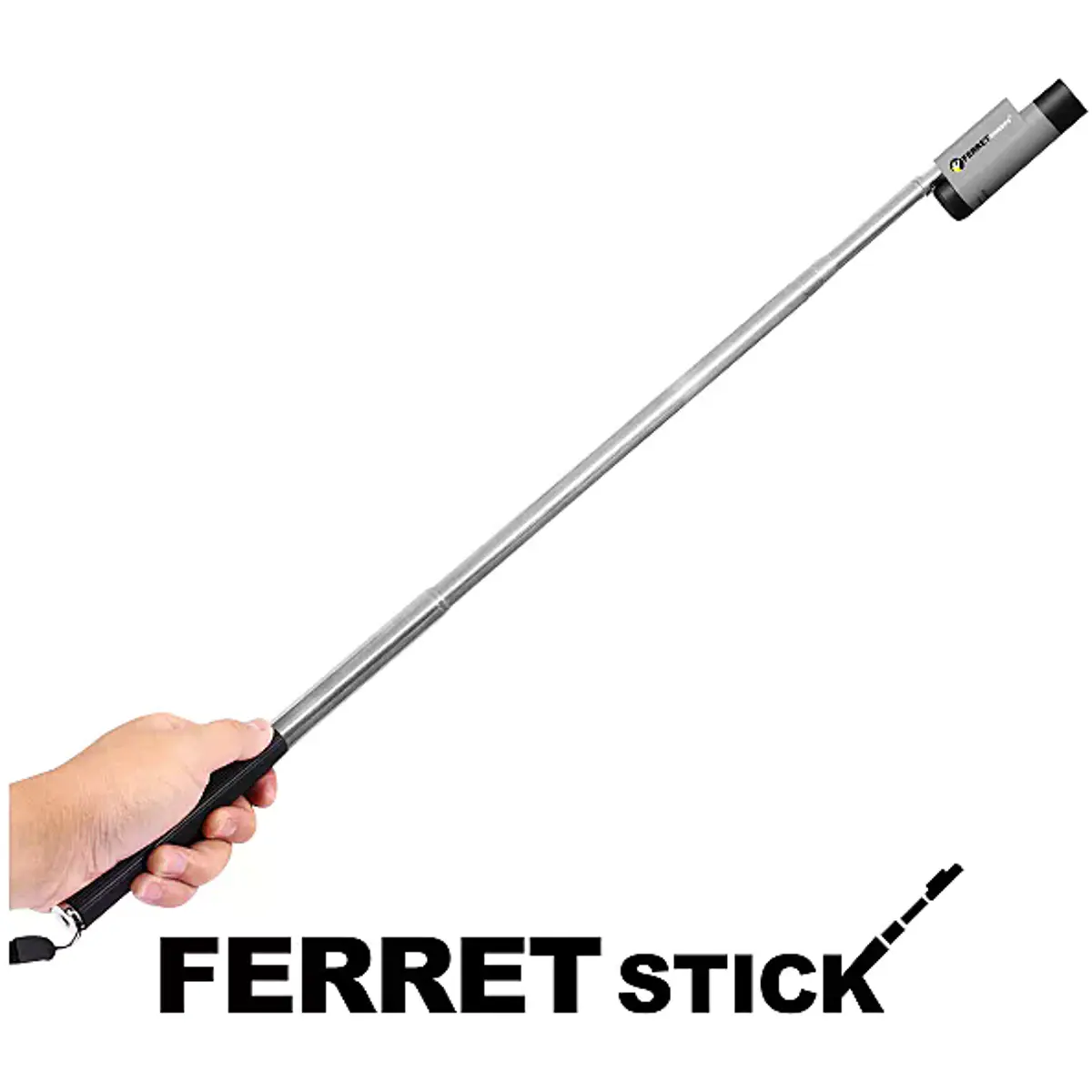 O Ferret Stick é uma haste extensível feita de aço inoxidável leve e resistente à ferrugem com cabo de borracha antiderrapante e pulseira de segurança na parte inferior.