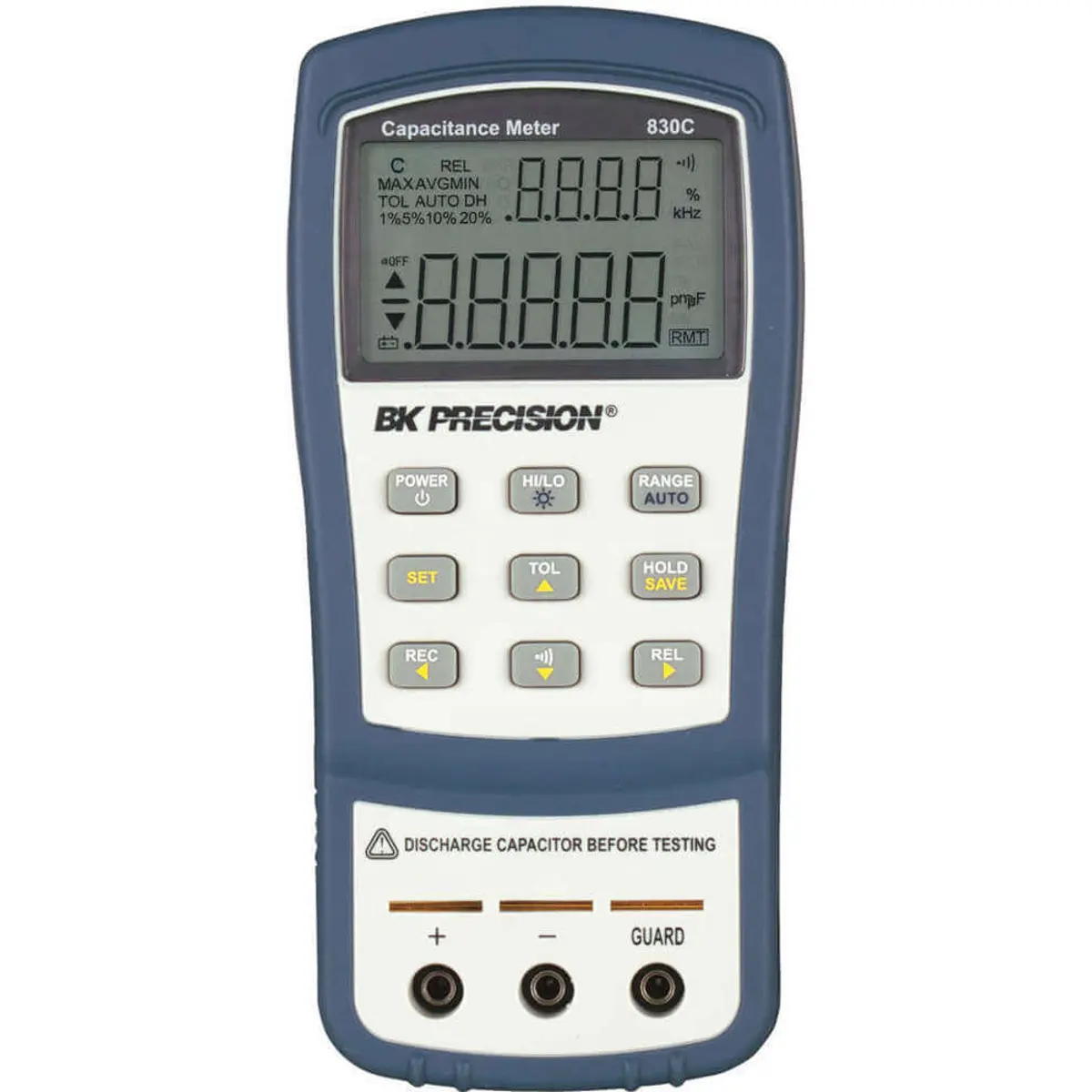 Diferentemente de outros instrumentos portáteis, como os medidores LCR, que utilizam um sinal AC com uma frequência de teste específica, o 830C mede a capacitância aplicando uma corrente constante que carrega brevemente e, em seguida, descarrega o condensador conectado.