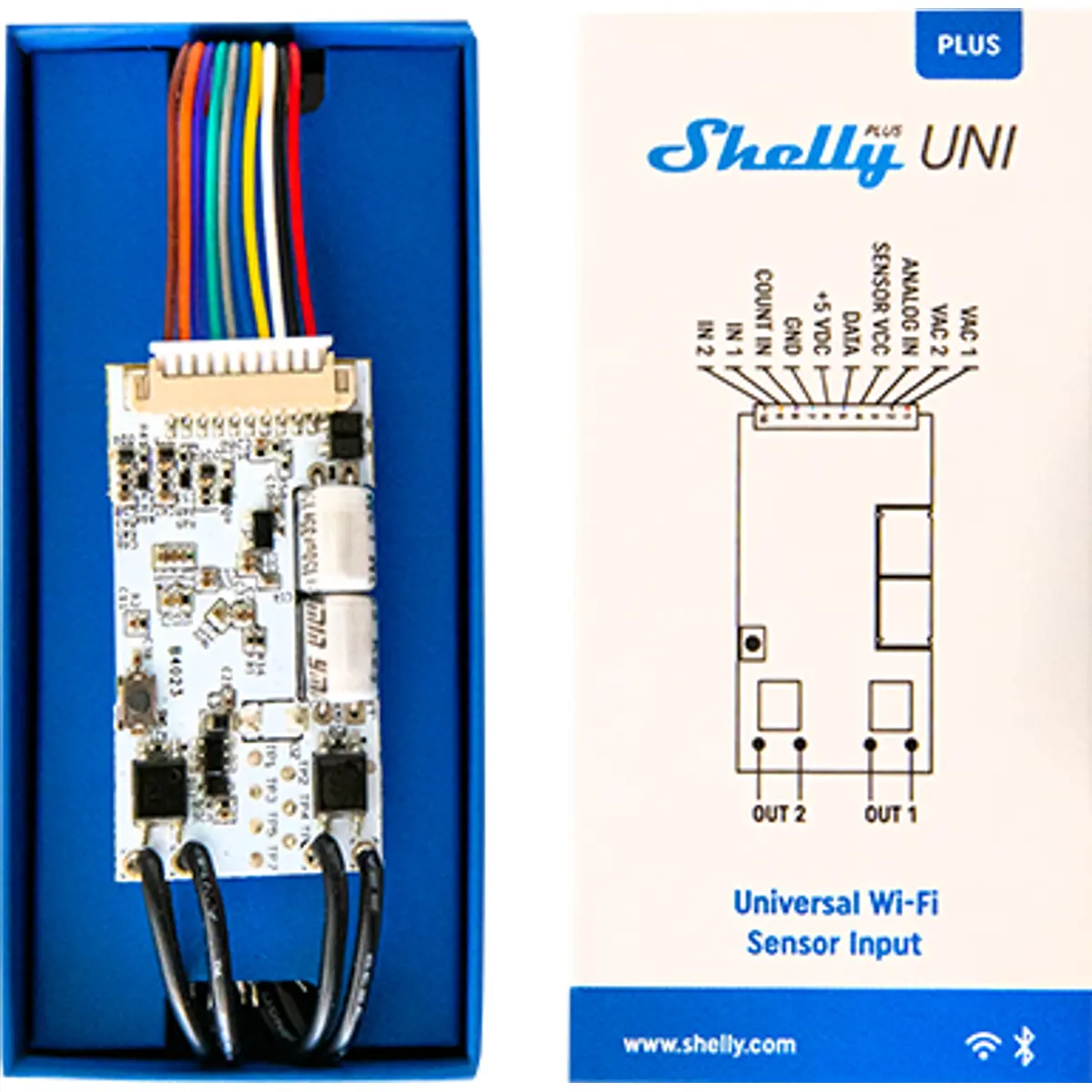 Shelly Plus Uni é um módulo universal inteligente de formato pequeno que inclui: