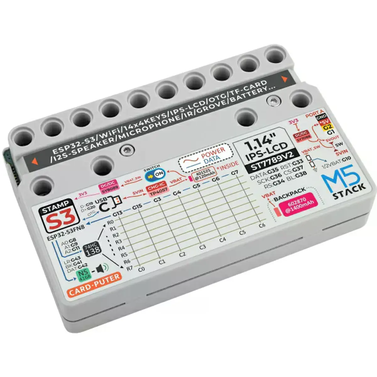 No coração do Cardputer está o M5StampS3, uma mini placa de desenvolvimento baseada no chip ESP32-S3. O Cardputer possui um potente processador dual-core, suporta a funcionalidade Wi-Fi e integra vários periféricos e sensores, o que o torna ideal para uma verificação funcional rápida, controlo industrial e sistemas de domótica.