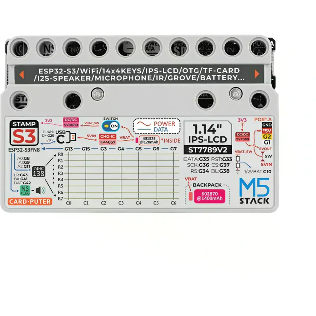 O dispositivo é alimentado por uma bateria de lítio de 120mAh+1400mAh (na base), eliminando as preocupações com a duração da bateria. Além disso, o Cardputer possui circuitos integrados de carregamento da bateria e de regulação da tensão que ajustam automaticamente a tensão e a corrente para proteger a bateria e o dispositivo. A base do Cardputer incorpora um íman, permitindo a sua fixação em superfícies metálicas, como frigoríficos ou quadros brancos. Além disso, a estrutura do Cardputer é compatível com as extensões de orifícios Lego, permitindo aos utilizadores criar designs ainda mais interessantes utilizando peças Lego.
