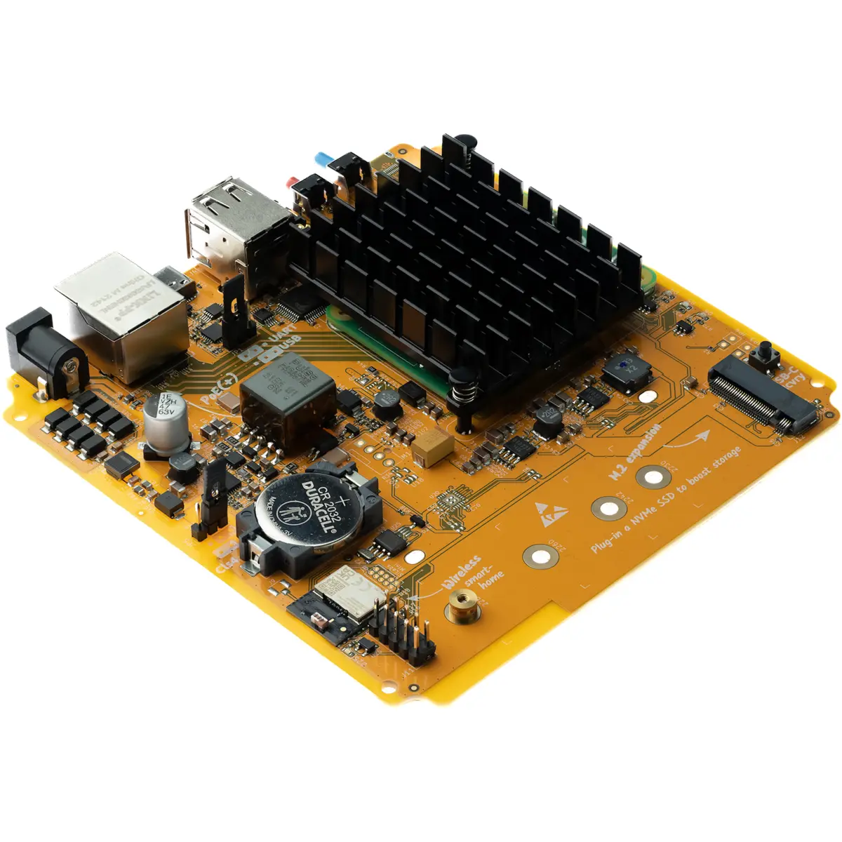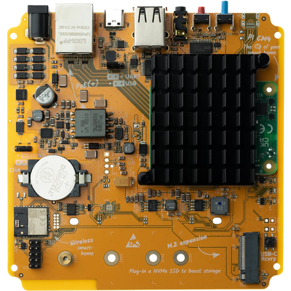 Hub de Casa Inteligente baseado no CM4, com PoE e módulo Zigbee, preparado para Thread e Matter, oferecendo automação residencial local e privada. A placa de suporte admite arranque direto a partir de NVMe, até 8 GB de RAM e 32 GB de eMMC, Ethernet Gigabit com PoE+, ranhura M.2 para NVMe, USB-A 2.0, USB-C, DAC de áudio estéreo de alta qualidade, RTC com pilha CR2032, GPIO compatível, LEDs indicativos e caixa em policarbonato semi-transparente. Ideal para integração com o Home Assistant e dispositivos compatíveis.