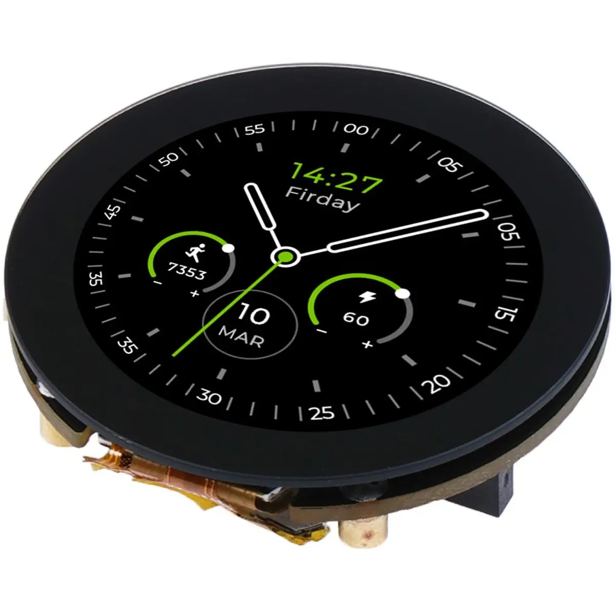 ◾ Ecrã Tátil Capacitivo, de 1.28 polegadas, redondo, com resolução de 240×240, 65K cores, proporcionando uma exibição de imagens claras e coloridas.