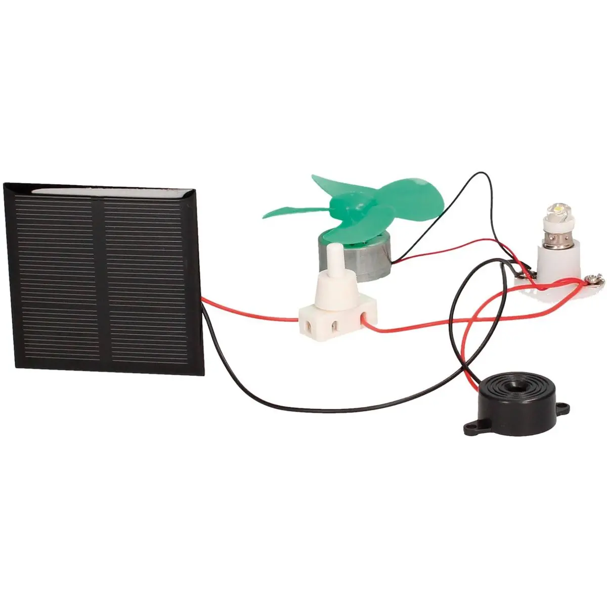 Kit escolar de eletrónica alimentado por energia solar, ideal para atividades pedagógicas. Inclui painel solar, motor DC, lâmpada LED E10, porta-lâmpadas, interruptor 2A, besouro, duas hélices de plástico e outros componentes básicos para montar projetos práticos. Permite explorar conceitos de energia solar, eletricidade, mecânica e controlo de motores, promovendo aprendizagens ativas em sala de aula ou em casa com experimentação segura.