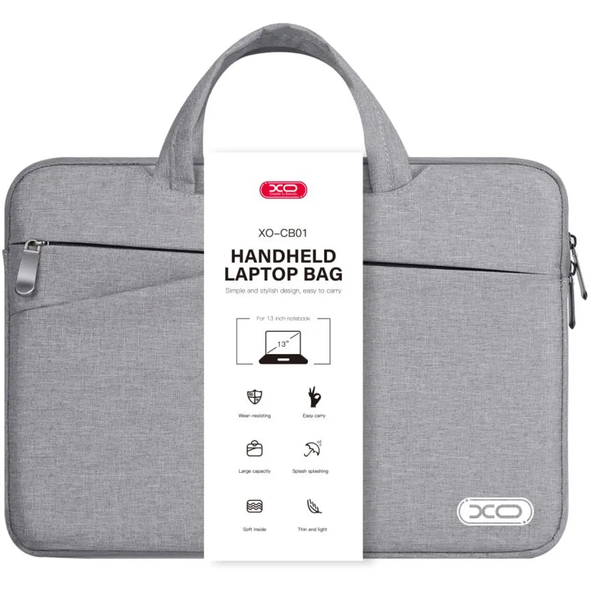 Mala para laptop projetada para dispositivos com tela de 13", equipada com um bolso externo para acomodar diversos acessórios de computador.