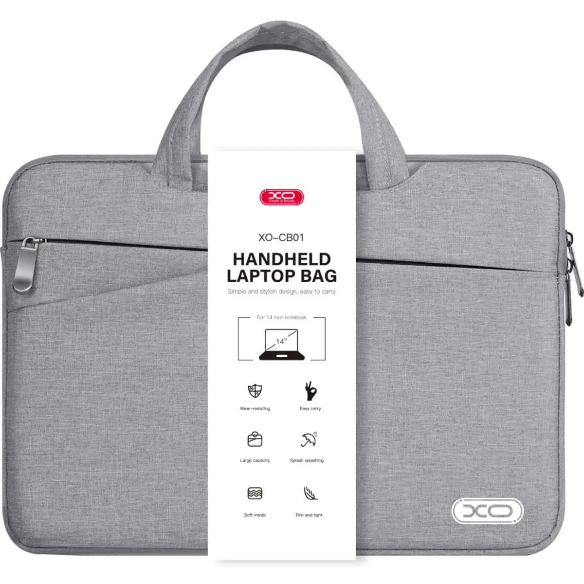 Mala para laptop projetada para dispositivos com tela de 14", equipada com um bolso externo para acomodar diversos acessórios de computador.