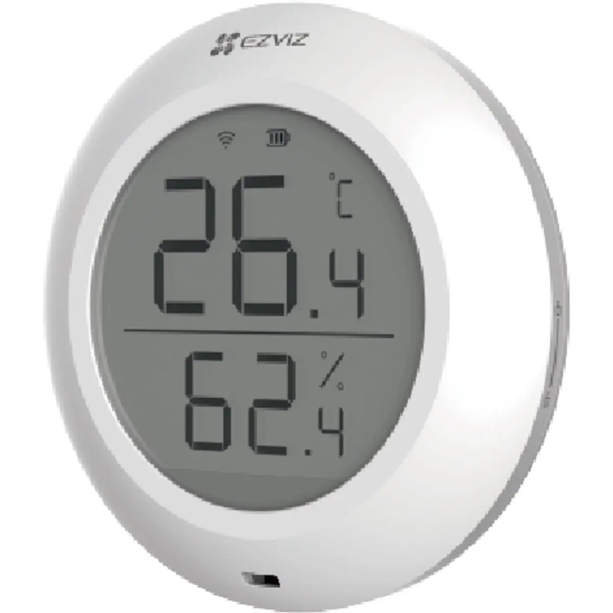Monitor de Temperatura e Humidade que deteta e apresenta a temperatura e os níveis de humidade e, em seguida, envia os respetivos dados ao gateway EZVIZ associado. Depois de adicionar o Monitor à Aplicação EZVIZ, pode visualizar os respetivos dados no seu telefone em tempo real; além disso, pode acionar outros produtos inteligentes EZVIZ para lhe proporcionar uma vida mais inteligente