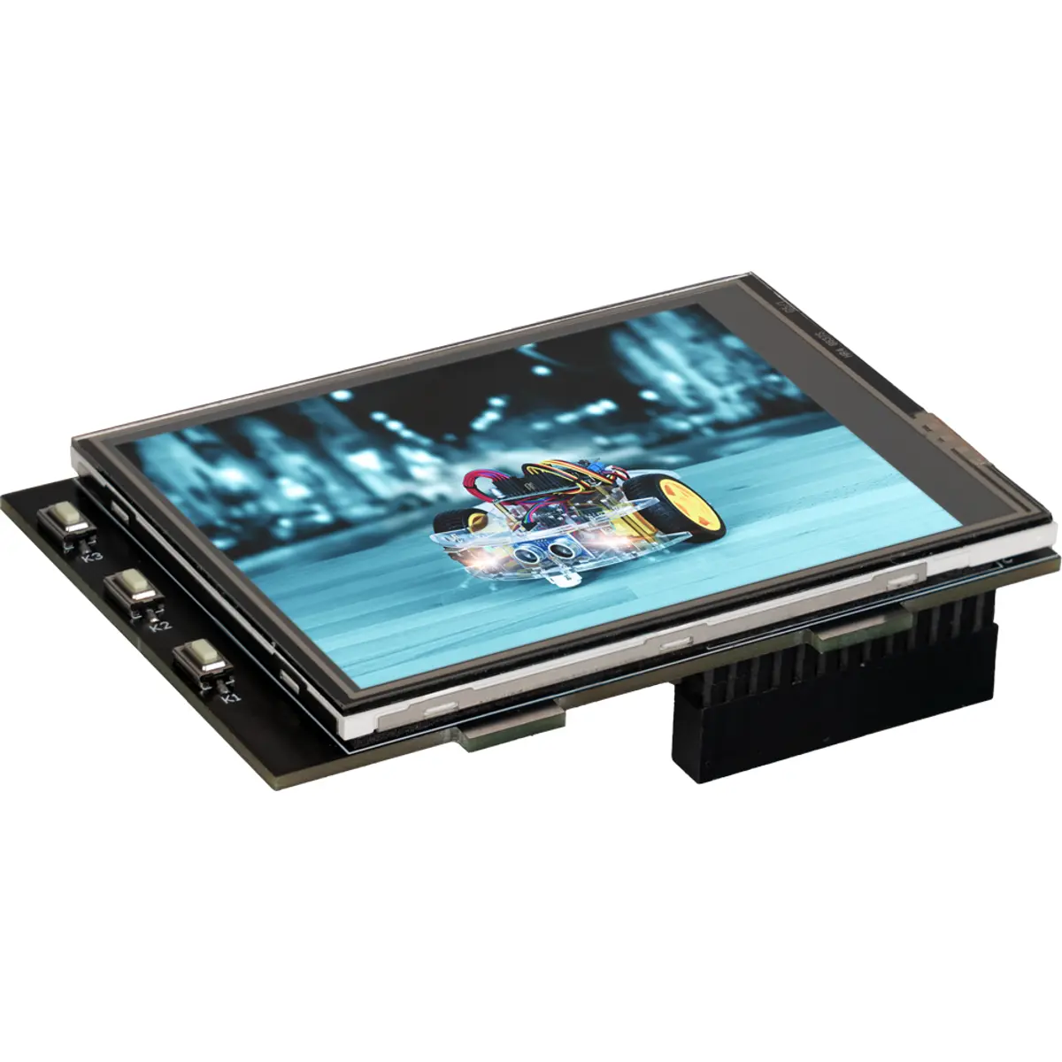 Display LCD de 3,2 polegadas com resolução de 320 x 240 e toque resistivo, compatível com Raspberry Pi. Inclui retroiluminação LED, ligação via cabeçalho GPIO e interface SPI. Possui três botões programáveis que podem ser atribuídos às funções desejadas e pode ser ligado diretamente ao Raspberry Pi, com controlo da retroiluminação via GPIO18. Usa os controladores XPT2046 e SSD1289, oferece 65536 cores, brilho de 350 cd/m² e operação entre 0 °C e 70 °C. Dimensões: 85 x 20 x 60 mm.