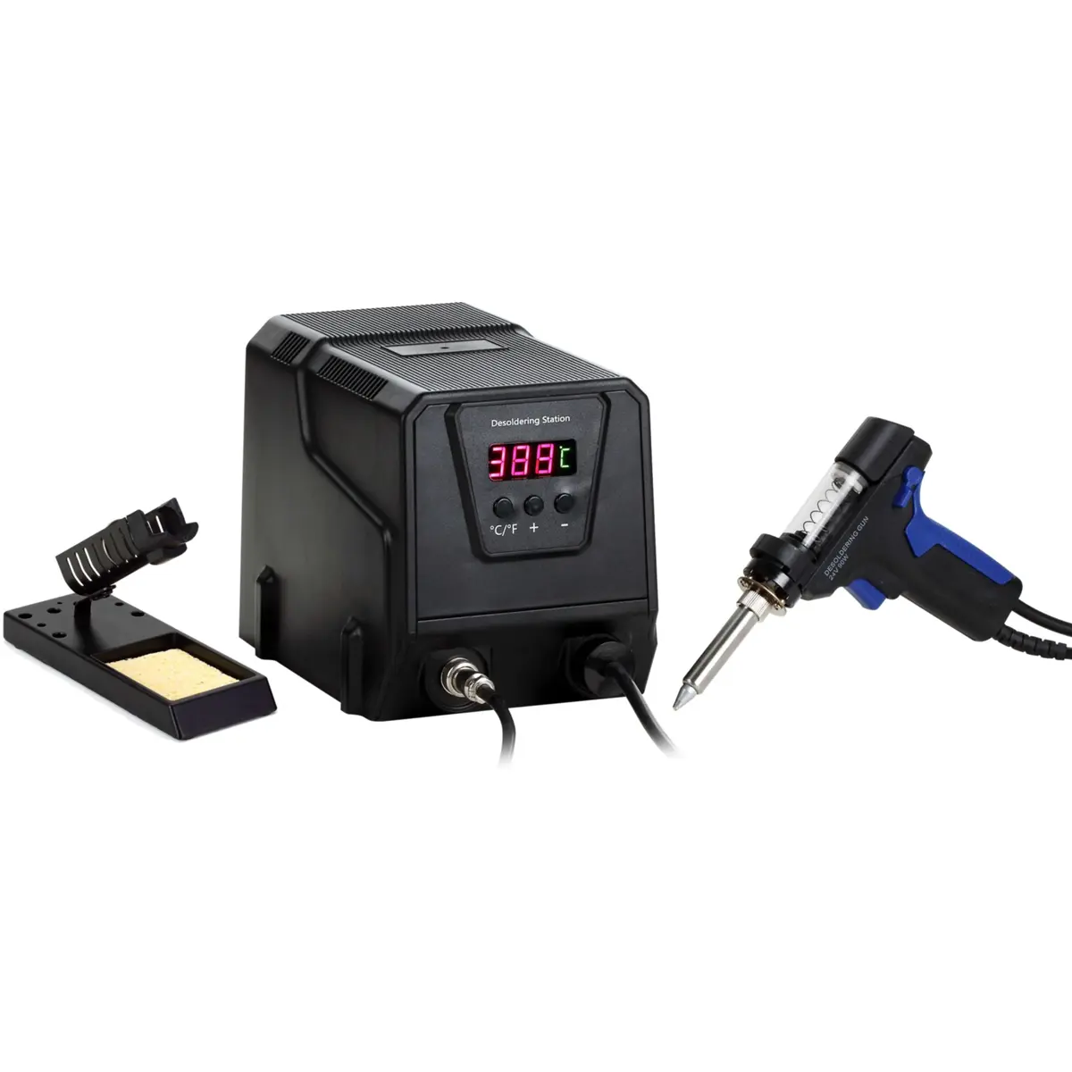 Em termos de conforto e segurança, um display LED mostra claramente a temperatura atual e a unidade selecionada, facilitando uma operação precisa. O controlo simples da estação com apenas três botões torna-a acessível mesmo para utilizadores menos experientes. Além disso, o suporte robusto do ferro de dessoldagem, com base estável, permite o armazenamento seguro da pistola quente durante e após a utilização.