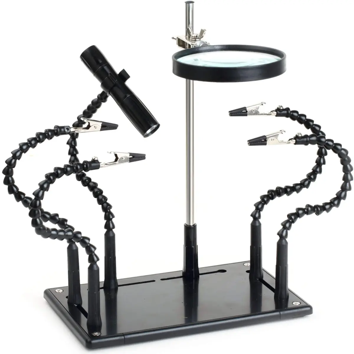 Suporte de bancada com quatro braços articulados para soldagem e montagem de placas de circuito, equipado com lupa de Ø60 mm e luz LED de alta intensidade. Oferece estabilidade e durabilidade graças à base metálica e tiras antiderrapantes, com clips crocodilo para segurar componentes durante a montagem. Alimentado por pilhas AA, o kit inclui base, braços, lupa e iluminação, ideal para profissionais e entusiastas que exigem precisão, iluminação direcionada e aumento de detalhes em trabalhos de eletrónica.