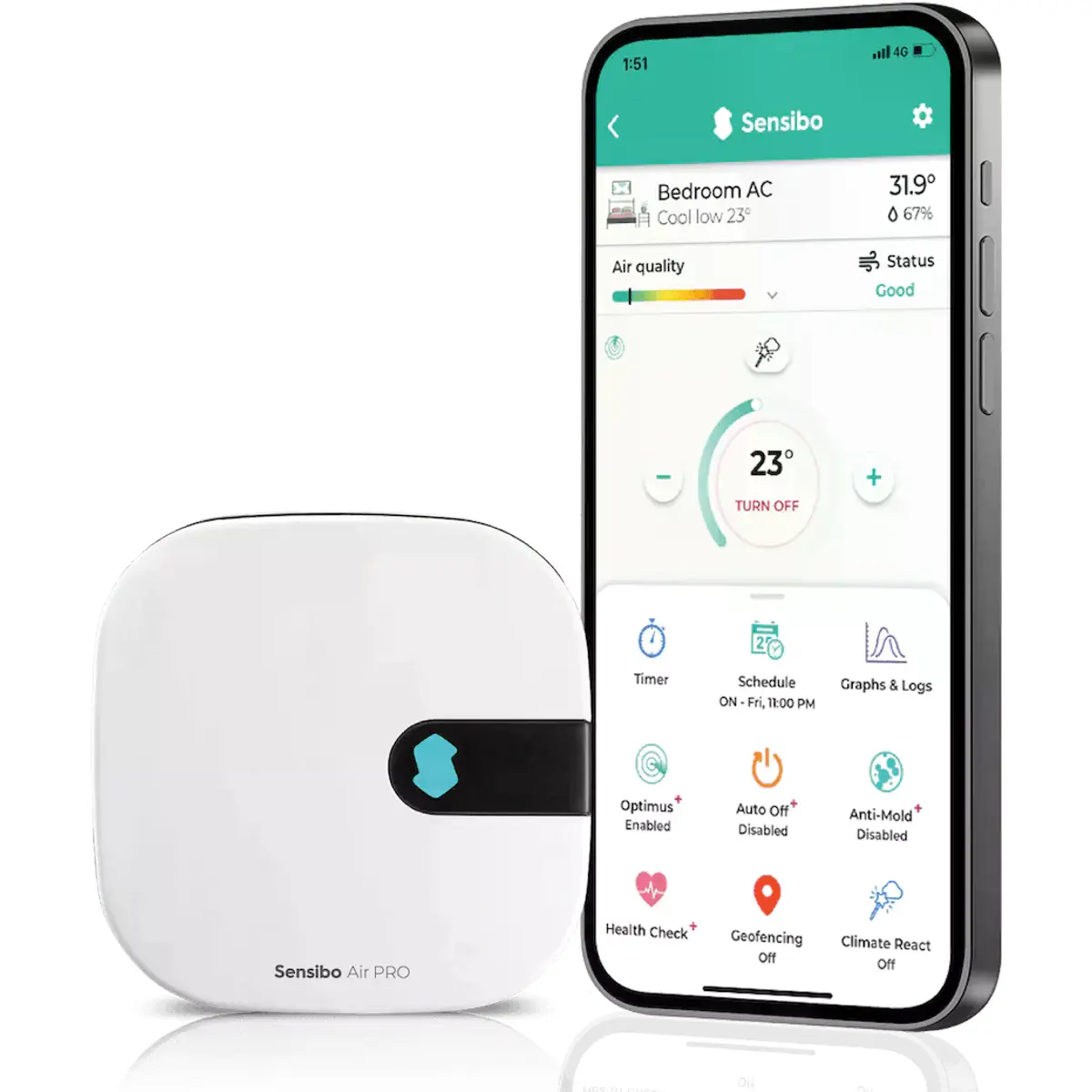 O Sensibo Air Pro tem as mesmas funcionalidades do Sensibo Air, mas acrescenta um sensor da qualidade do ar, permitindo fazer a monitorização dos níveis de CO2 e TVOC no ar da sua casa e tomar medidas para se proteger a si e aos seus familiares.