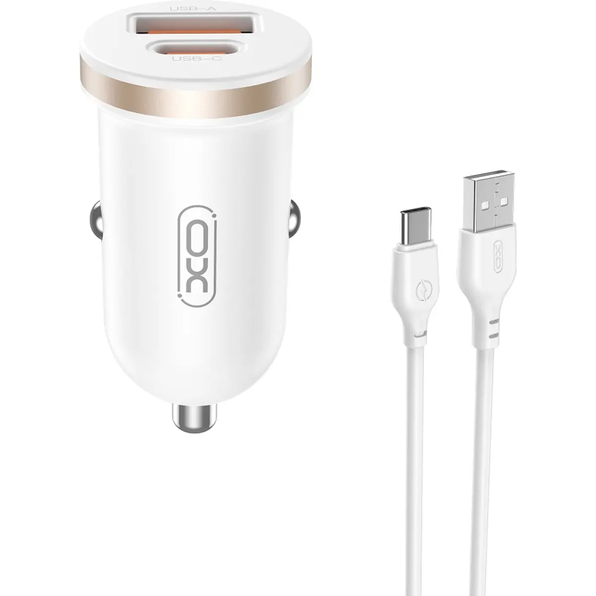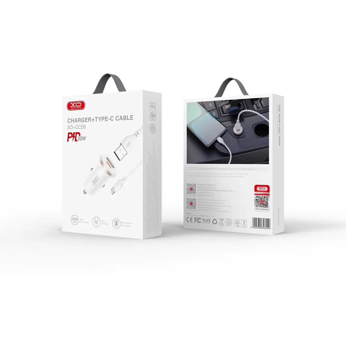 XO CC56 - Carregador de Isqueiro (12..24VDC) USB-A QC3.0 + USB-C PD 30W (c/ cabo USB-C) - Branco