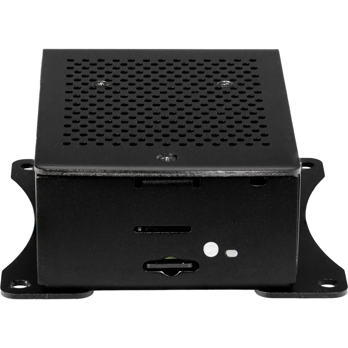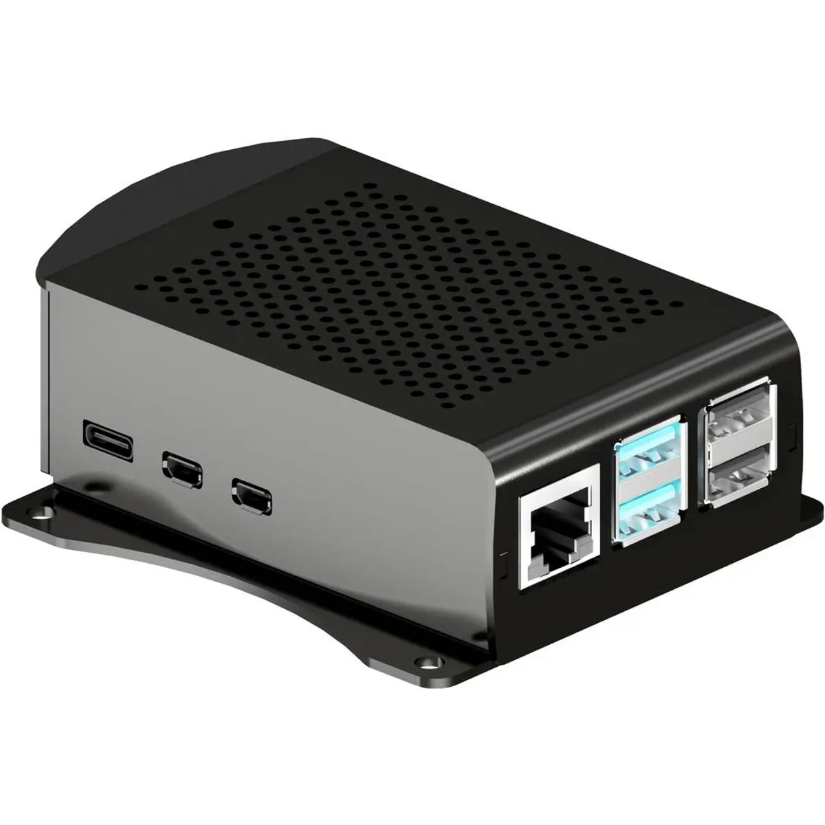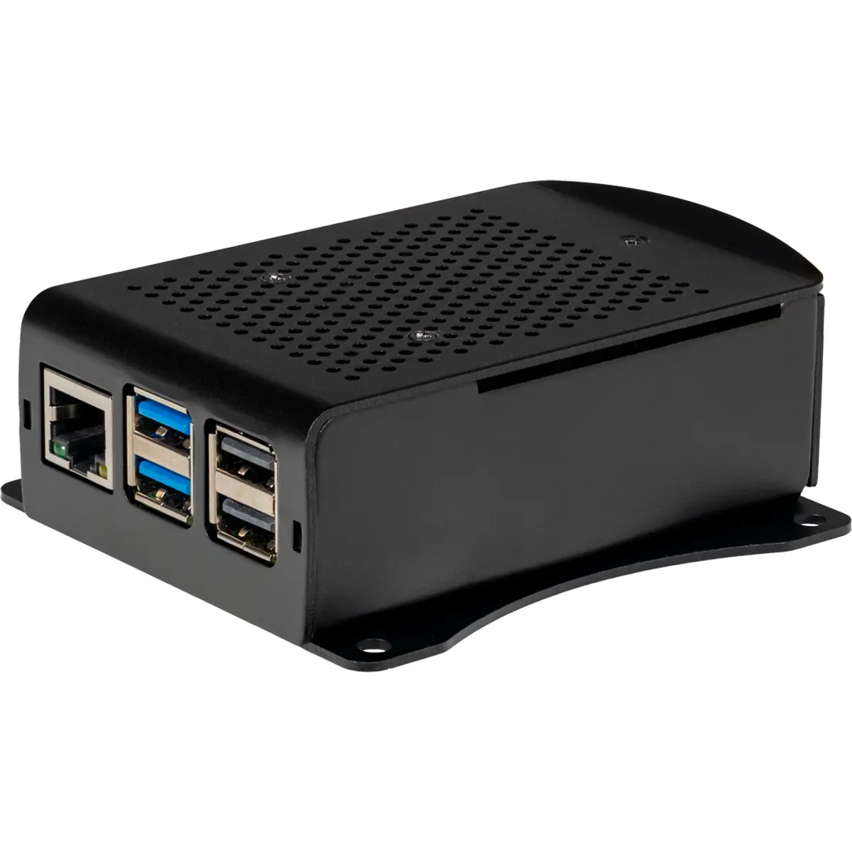 Esta caixa de alumínio preta e robusta, para o seu Raspberry Pi 5, pode ser utilizada de forma flexível, uma vez que pode ser fixada a paredes ou móveis utilizando o suporte de alumínio fornecido.