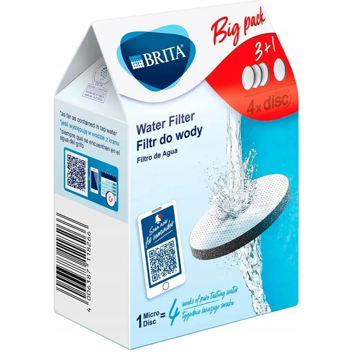 Pack de 4 filtros de água, em forma de disco, para garrafas e jarros purificadores de água da marca BRITA.