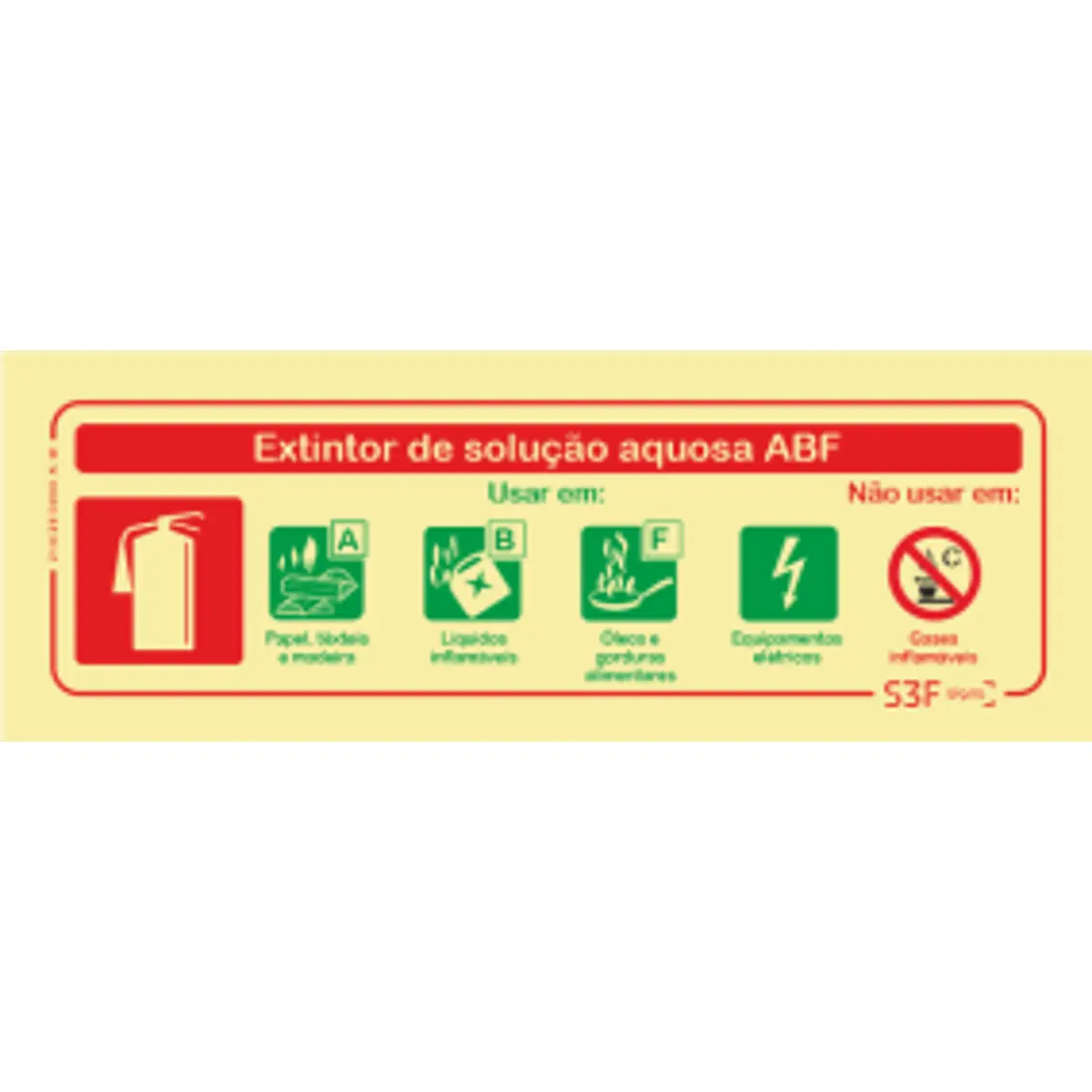 Placa de sinalização fotoluminescente ''Extintor de solução aquosa ABF'' - 240x85mm