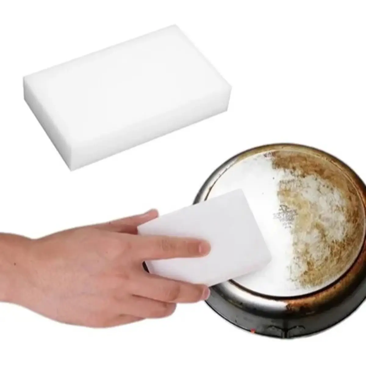 Esponja mágica é feito de melamina, um produto alcalino orgânico, rico em nitrogênio, que, em seu estado sólido, é um abrasivo poderoso, mas delicado. Lida eficazmente com manchas sem o uso de detergentes. É adequado para remover marcas de canetas de paredes e pisos, limpar móveis de jardim, brinquedos e caixas de plástico (eletrodomésticos, teclados, controles remotos). Limpa perfeitamente as solas brancas dos sapatos. Remove o calcário de acessórios de banheiro, manchas de banheiras, pias e gorduras de exaustores de cozinha. Limpa azulejos e juntas. Remove resíduos de cera e pasta de polimento de pára-choques e frisos decorativos.
