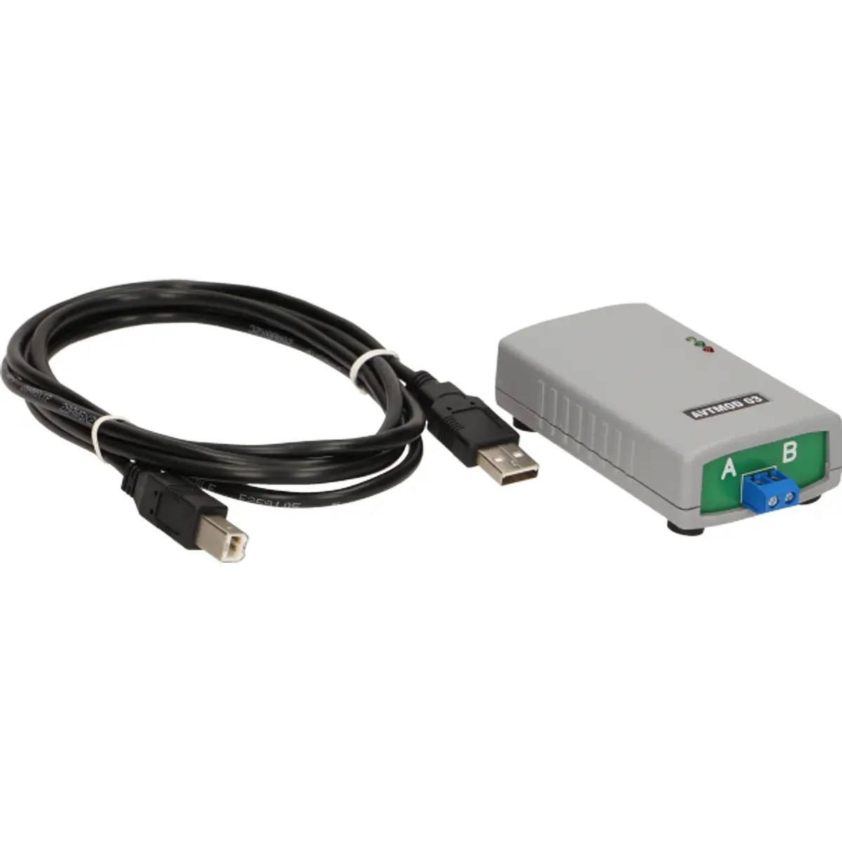 O conversor permite que o barramento de comunicação RS-485 seja conectado a um PC através de uma porta serial USB. A comunicação entre os módulos do sistema RS-485 é realizada através de um barramento comum de dois fios, e a cooperação com o computador é feita através da interface USB (cabo incluído).