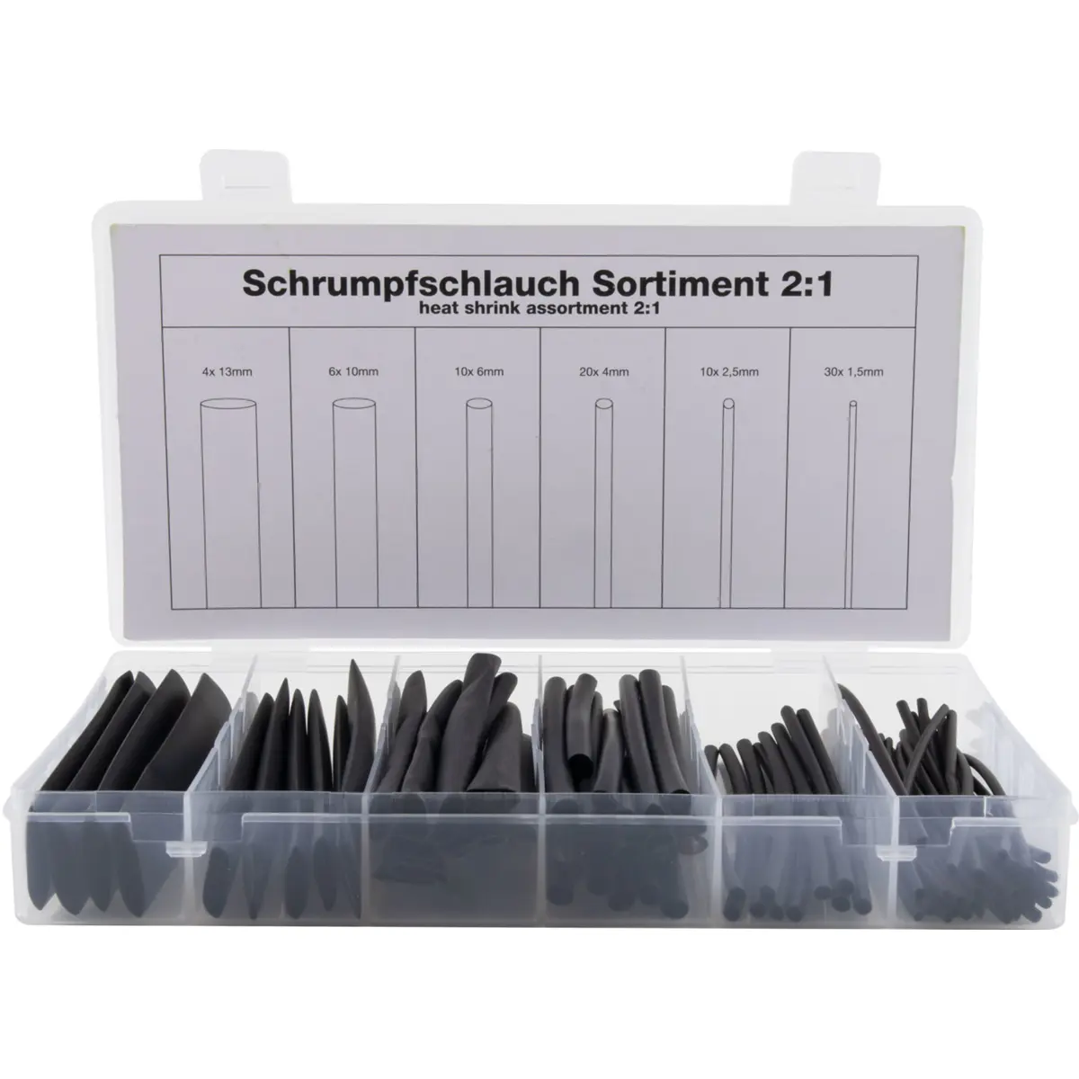 Kit de mangas termorretráteis pretas com comprimento de 100 mm, composto por 80 peças em várias dimensões para isolamento de cabos e componentes elétricos. Inclui seis diâmetros diferentes: Ø1,5-0,75mm; Ø2,5-1,25mm; Ø4,0-2,0mm; Ø6,0-3,0mm; Ø10-5,0mm; Ø13-6,5mm, com rácio de encolhimento 2:1. Ideal para proteção, organização e isolamento de fiação em aplicações elétricas.