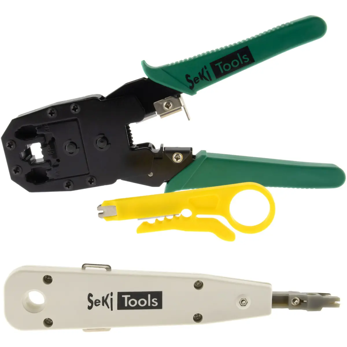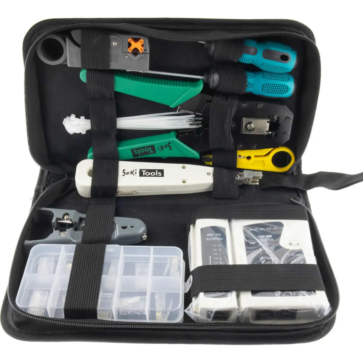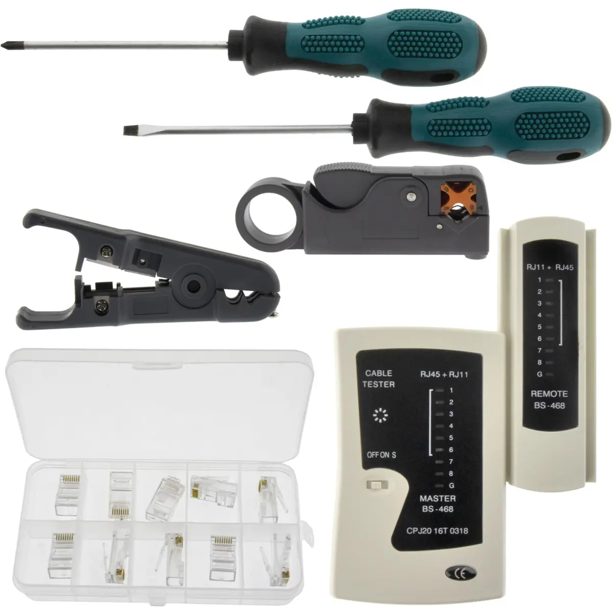 Este kit profissional de rede inclui alicate de cravar para conectores RJ45 (8P8C), RJ11/RJ12 (6P4C/6P6C) e RJ10 (4P4C). Possui ferramenta de impacto LSA com gancho retrátil, ferramenta LSA com descarnador, e um testador de rede que cobre RJ45 e RJ11/RJ12; a bateria de 9V não está incluída. Inclui descarnador com ajuste fino, chave de fenda e chave Philips com cabo anti-deslizante, 10 conectores modulares RJ-45 UTP e 10 abraçadeiras de cabos. Ideal para instalações de redes e manutenções.