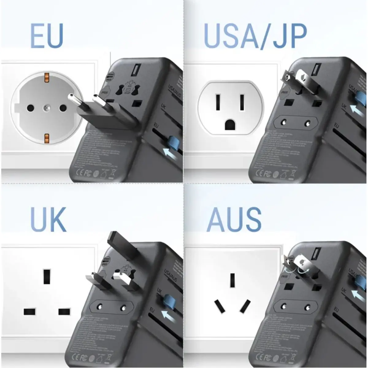 Adaptador de viagem universal com tecnologia GaN-III e carregamento USB PD3.0 (e Quick Charge 4+), oferecendo até 85W de potência total a partir de uma entrada 100-250V. Possui três portas USB-C e duas USB-A para carregar múltiplos dispositivos simultaneamente, com suportos de 5-20V e potências até 70W por porta USB-C e 60W por porta USB-A. Ideal para viajar em mais de 180 países, com fusíveis duplos de 10A para maior segurança. Compacto e leve, é a solução prática para viajar com portáteis, smartphones e tablets sem compromissos de energia.
