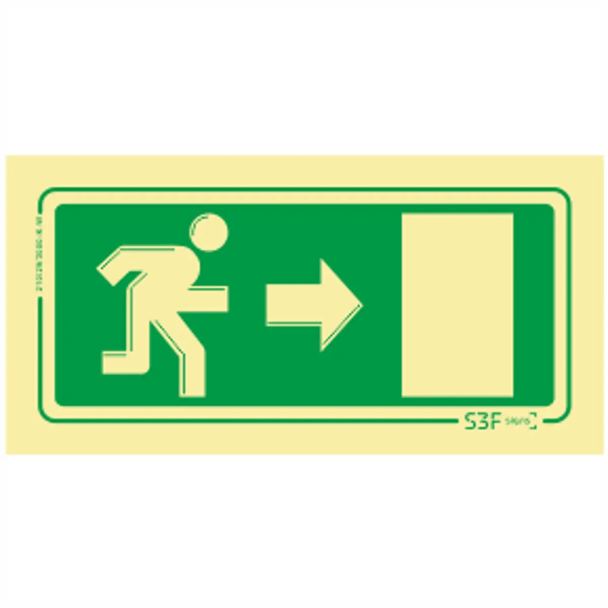 Placa de sinalização fotoluminescente para saída de emergência com orientação Direita, em PVC rígido de 2 mm, auto-extinguível e durável. Não tóxica, sem fósforo, sem chumbo e sem aditivos radiativos. Impressão digital com tintas UV resistentes, garantindo boa visibilidade. Certificada ISO 9001:2008/ISO 14001:2004 e CERTIF, em conformidade com UNE 23035/2003. Ideal para interiores, proporcionando evacuação mais segura e rápida.