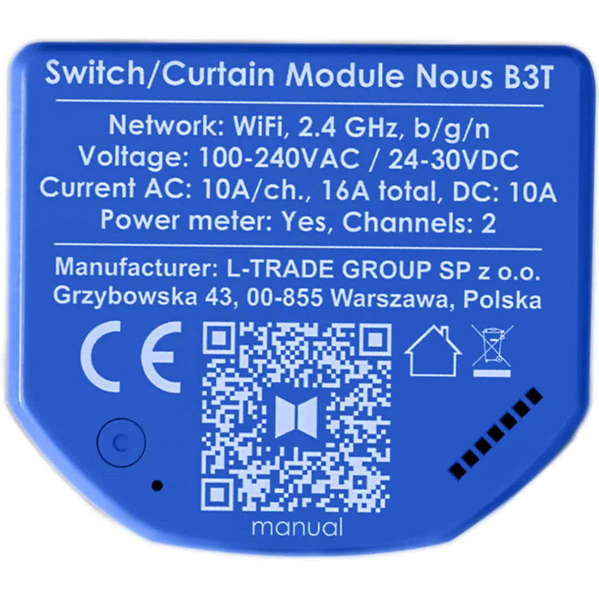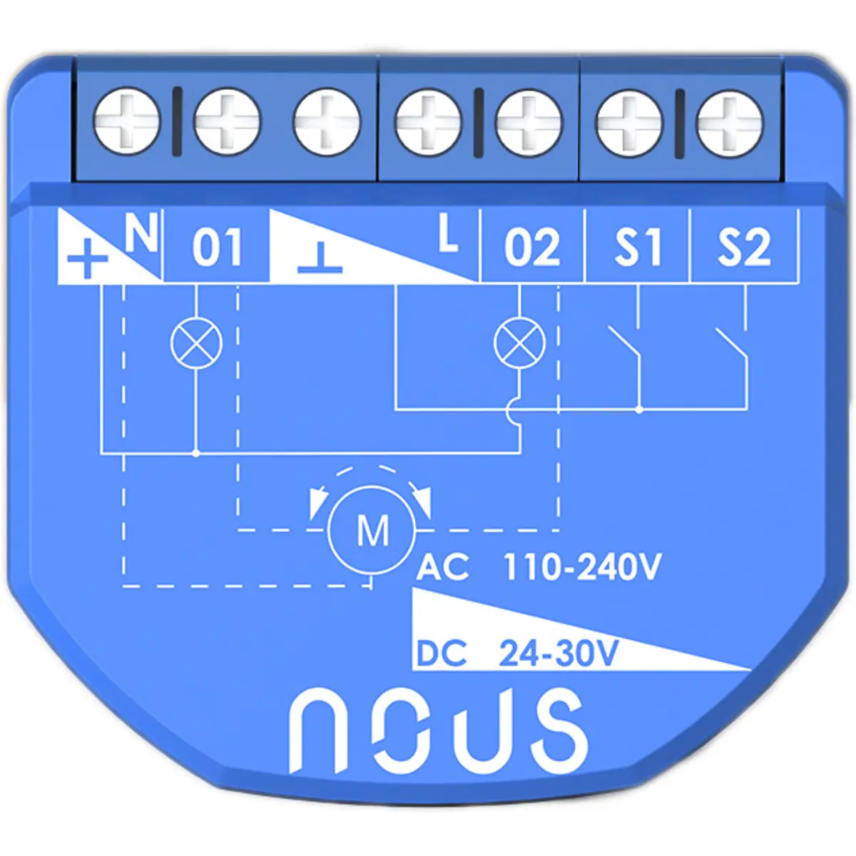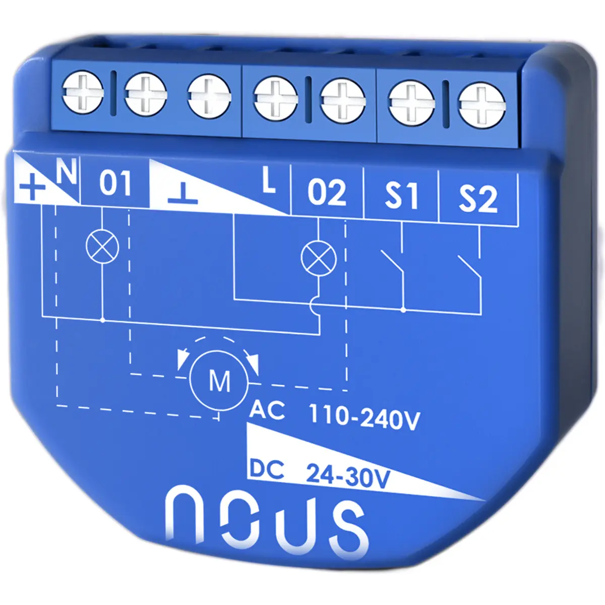 O módulo relé inteligente Wi-Fi Nous B3T de dois grupos, com contador de consumo, permite controlar dois circuitos separados (por exemplo, luz de vários grupos) ou um motor (por exemplo, motor de persiana, motor de estore, motor de cortina).