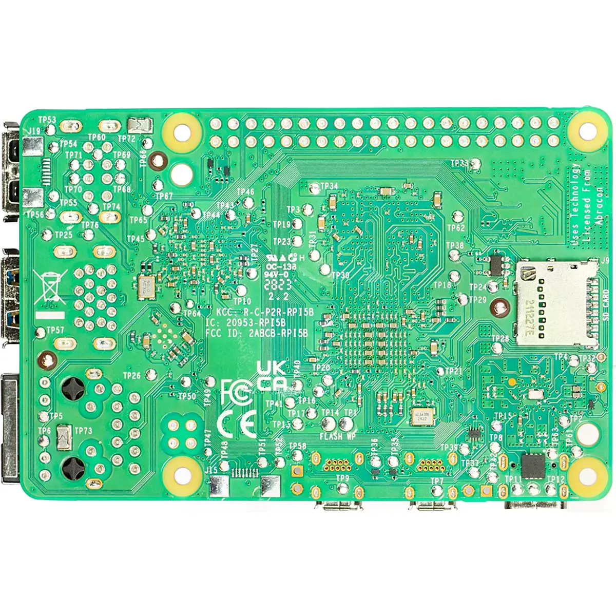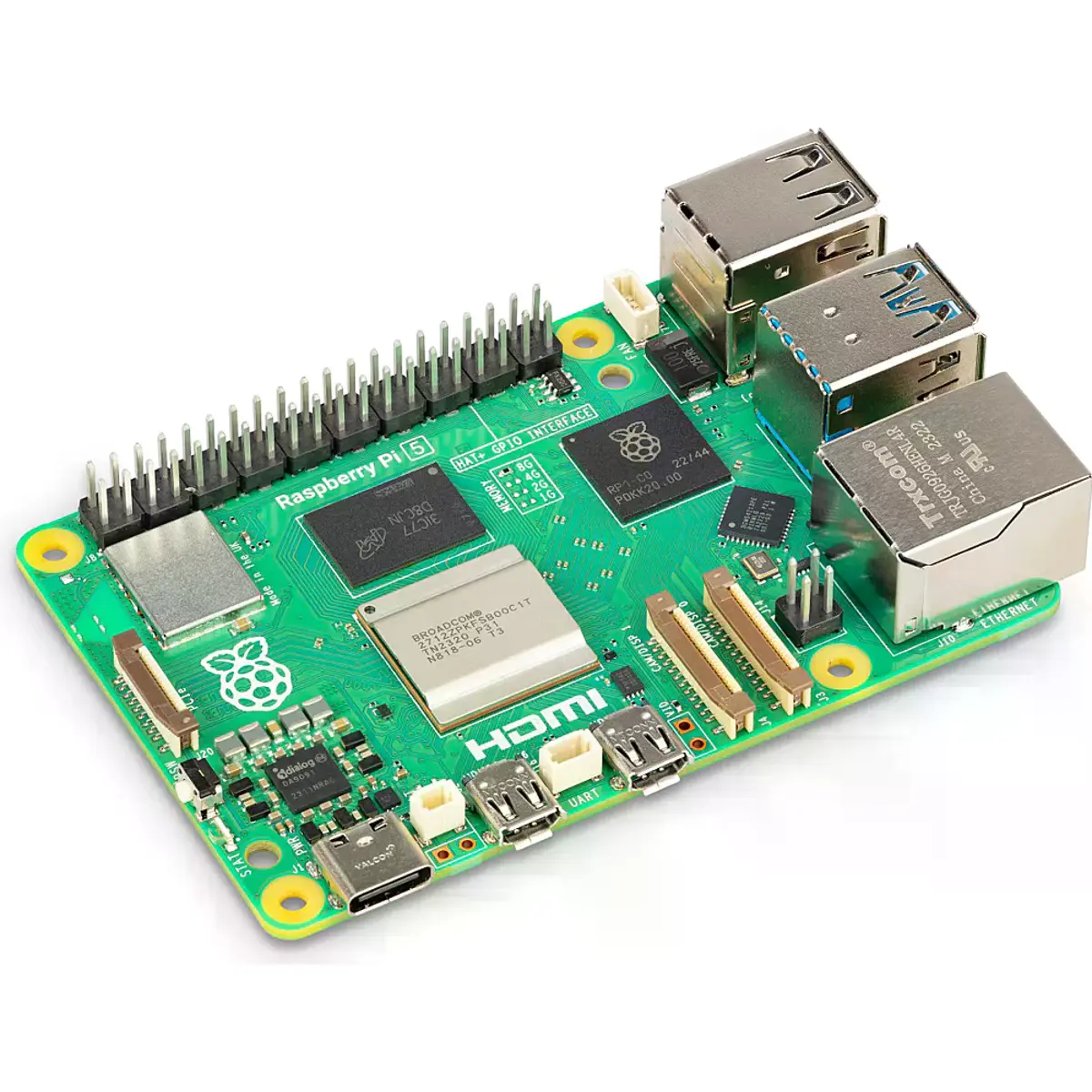Pela primeira vez, este Microcomputador Raspberry Pi, de tamanho normal, já utiliza chips construídos internamente na Raspberry Pi. O "southbridge" RP1 fornece a maior parte das capacidades de E/S para o Raspberry Pi 5 e proporciona uma mudança radical no desempenho e na funcionalidade dos periféricos.
