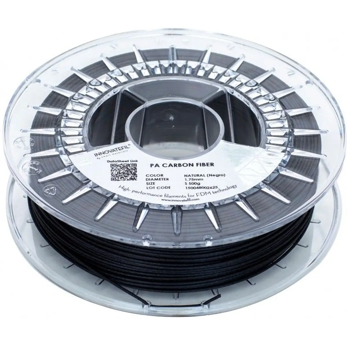 INNOVATEFIL PA CF é um filamento com alta resistência mecânica e excelente desempenho a altas temperaturas. A combinação de poliamida e fibra de carbono permite a impressão de objetos grandes sem deformação.