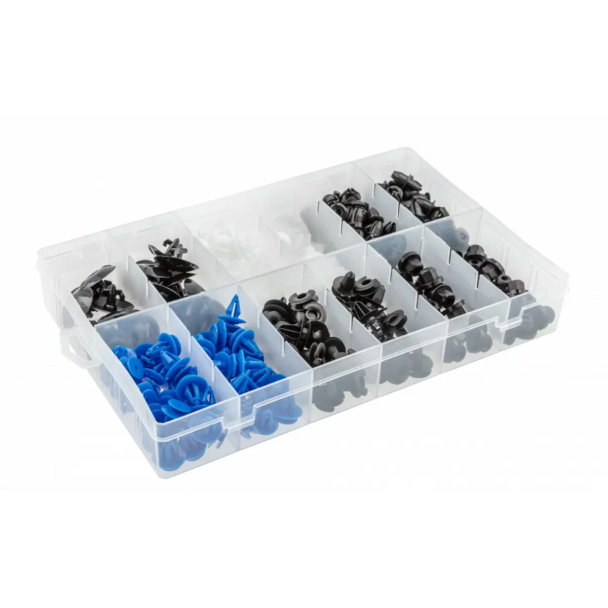 Conjunto de clips de acabamento automotivo com 6 tipos, 300 peças, ideal para trabalhos de carroçaria, para-lamas, guarda-lamas, para-choques e coberturas. Inclui clips de montagem, fechos, grommets, clips de retenção e molduras, entre outros. Fabricados em plástico durável, adequados para uso profissional e de bricolage.