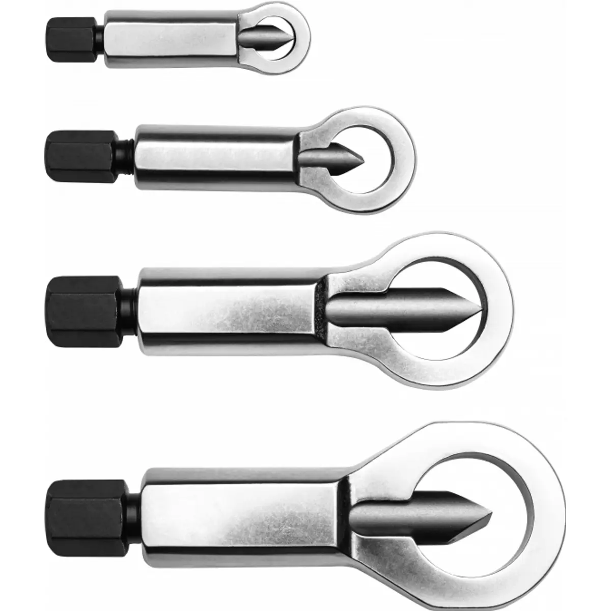 Conjunto de 4 cinzéis de diferentes tamanhos para a remoção segura de parafusos e porcas excessivamente apertados, corroídos ou rachados, bem como parafusos com cabeças danificadas.