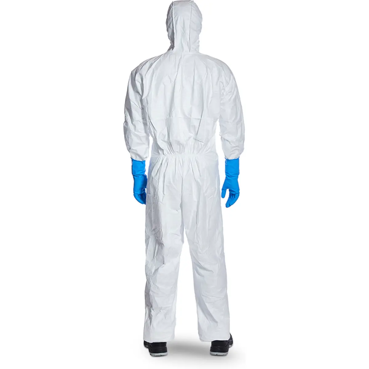 Fato-macaco com capuz em branco robusto, mas leve (menos de 180 g por peça). Capuz em três partes para um ajuste ideal à cabeça e rosto durante movimentos. Face, pulsos e tornozelos elásticos, bem como elástico na cintura fixado com cola. Área da virilha ampla para maior liberdade de movimento. Fecho de correr grande e fácil de manusear.