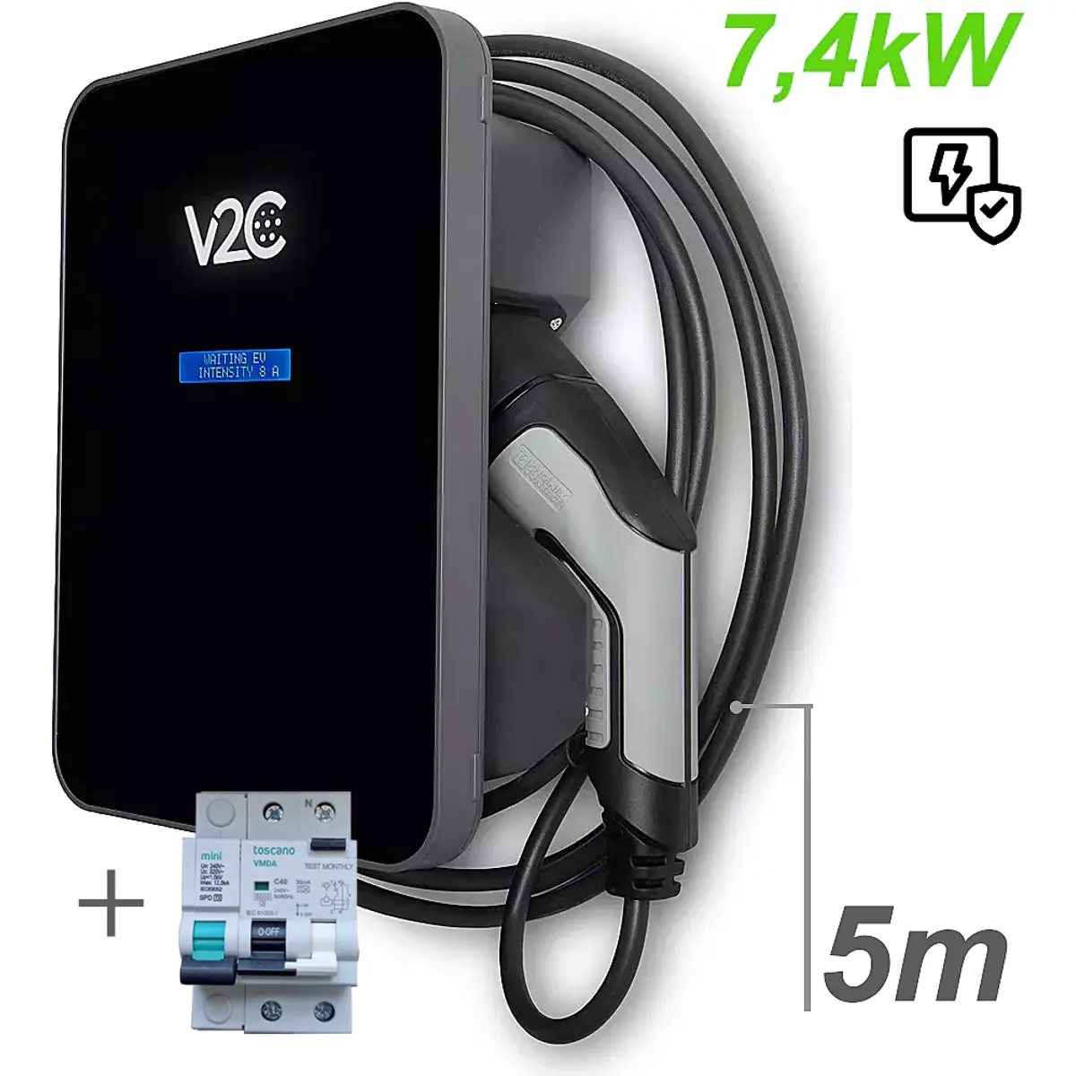 V2C TRYDAN TRY32-1-L5-P-F - Carregador para carro elétrico (Wallbox) de 7,4kW monofásico c/ cabo T2 5m + Proteção + Detetor Fugas DC